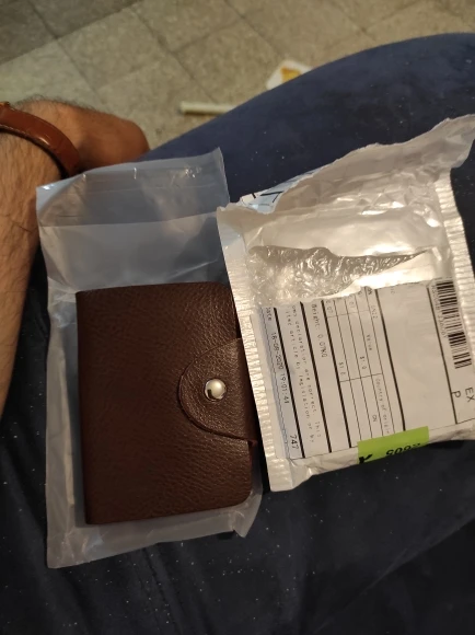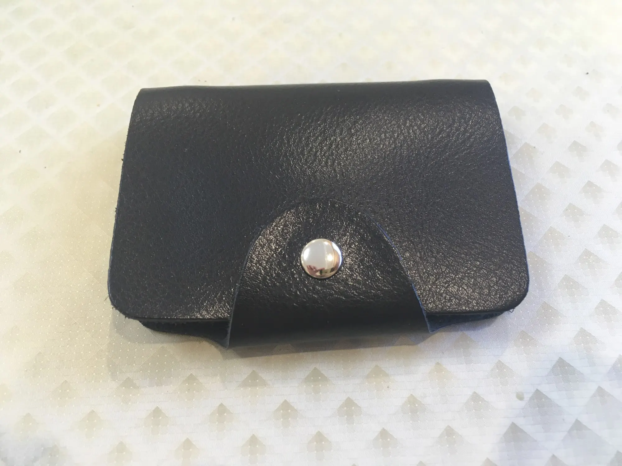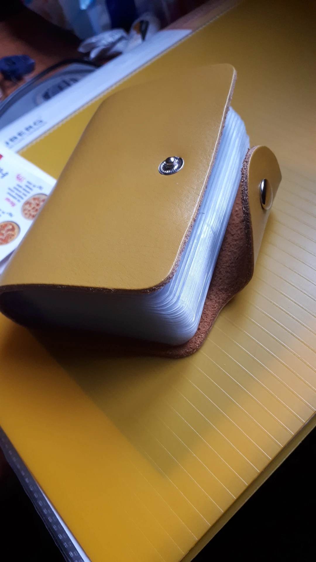 Хороший держатель для карт. Я думаю, что это кожа. Хорошее качество. Визитки поставляются без проблем.