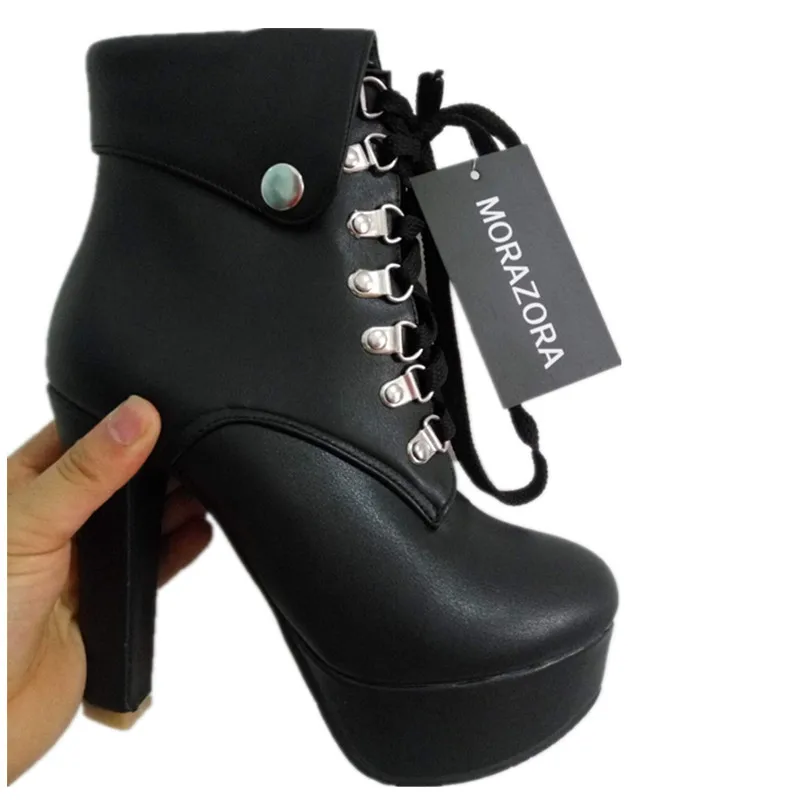 MORAZORA/2018 новые модные женские ботильоны на шнуровке; женские мотоциклетные ботинки на высоком каблуке; женская обувь на платформе; сезон осень-зима