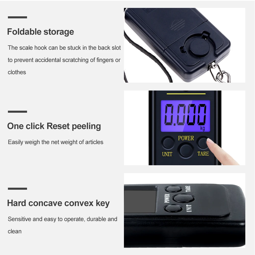 Температурный дисплейФункция автоматического отключенияСигнализация с низким энергопотреблением.Совершенно новые портативные подвесные Электронные цифровые весыБаза на основе встроенного микрокомпонентного ядра,Портативный карманный размер, с высокой точностьюНесколько весовых единиц: кг/фунт/унцийУдобно для семьи, магазина, кухни, рыбалки, багажа, использования на открытом воздухе или в качестве подарка Характеристики:Максимальная масса: 40 кг/88Lbs/ 1410 унцийМинимальный вес: 10 г/0.04Lb/0,7 ozРазмер: 13 см x 5 см x 2 см прибл.Режимы взвешивания: кг, фунты, унцииПитание от 2 батареи AAA (не входит в комплект)