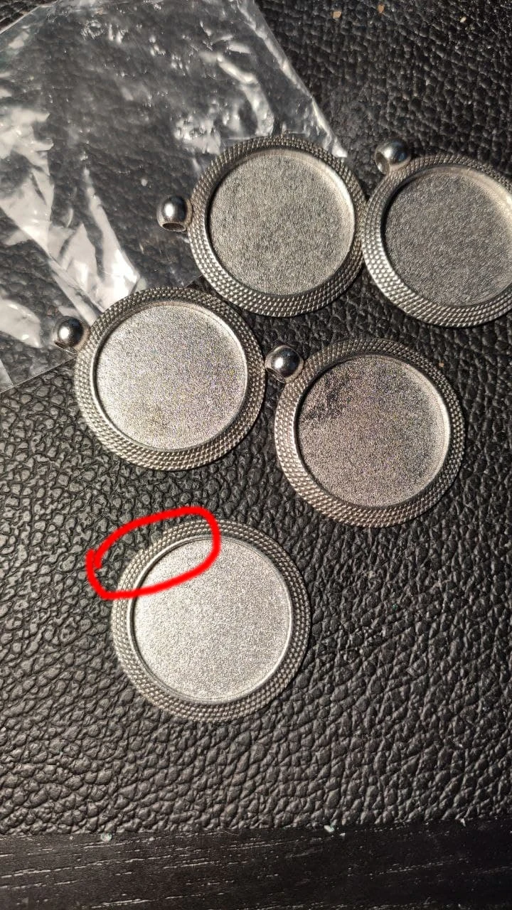 Thanks for your "service". Every time I buy a lot, they send me defective things. This time the base for the pendant without the bail, and the scratched base for the pendant in steel. This cannot be used for sale