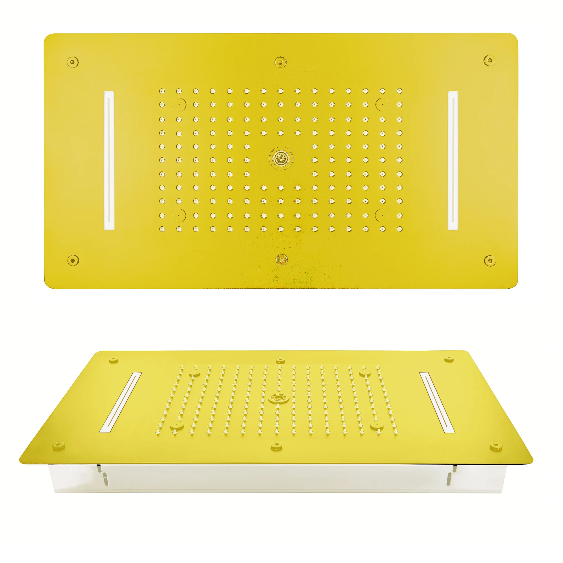 Он изготовлен из SUS304 иМатовый черный, матовый Цирконий Золотой, зеркалоЗакончено, Размер 700x380 мм, есть 4 функции включает в себя: дожди, водопад, пузырь и туман, с роскошными светодиодный ными огнями, протестированы с 3 бар давления воды, Скорость потока: туман: 9 л/м; Дождь:15л/м; Водопад: 15л/м; Пузырь: 15л/м; Он был встроен в потолок, когда мы устанавливали его, размер отверстия потолка 665*345 мм. ПНапряжение питанияИспользуется для насадки для душа 90 ~ 260VAC.