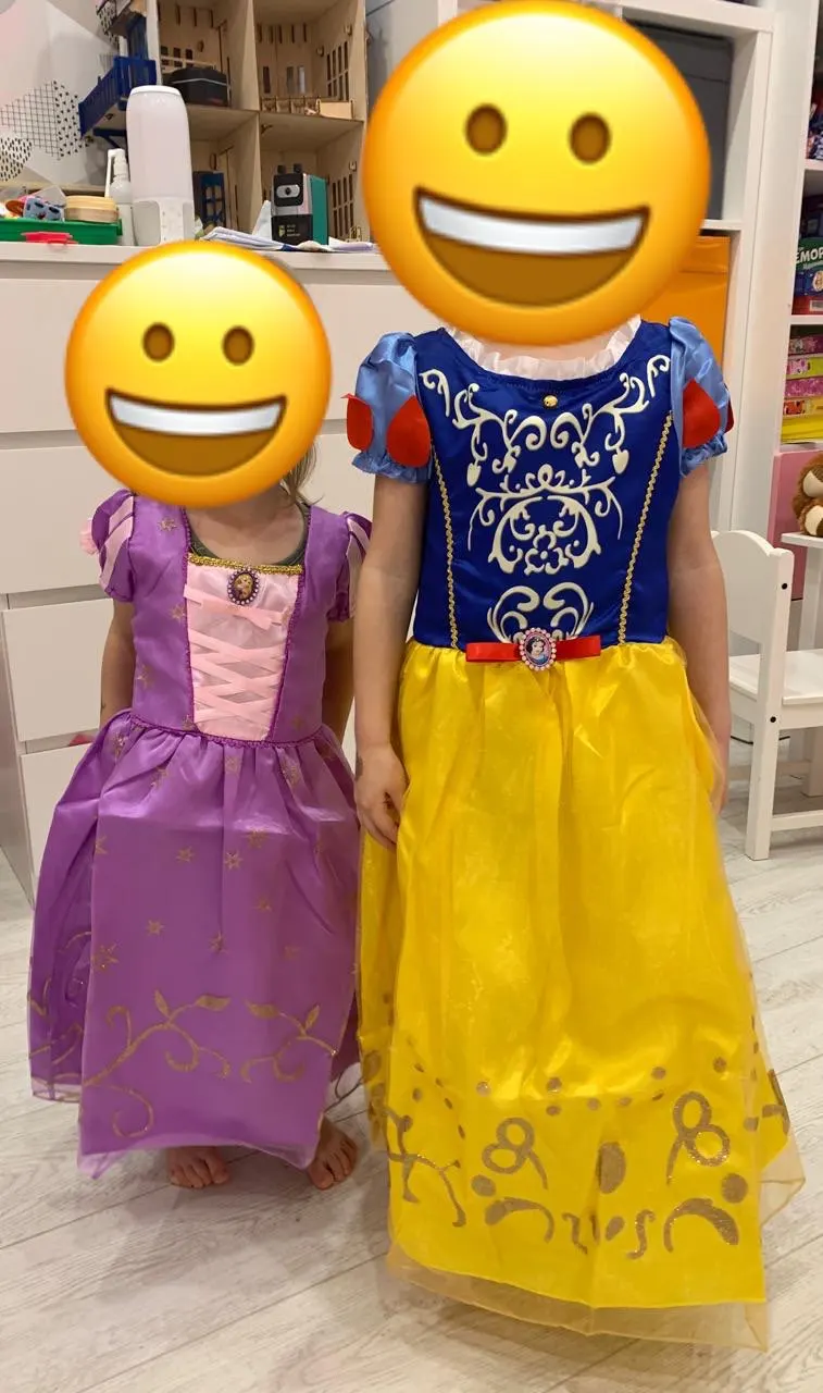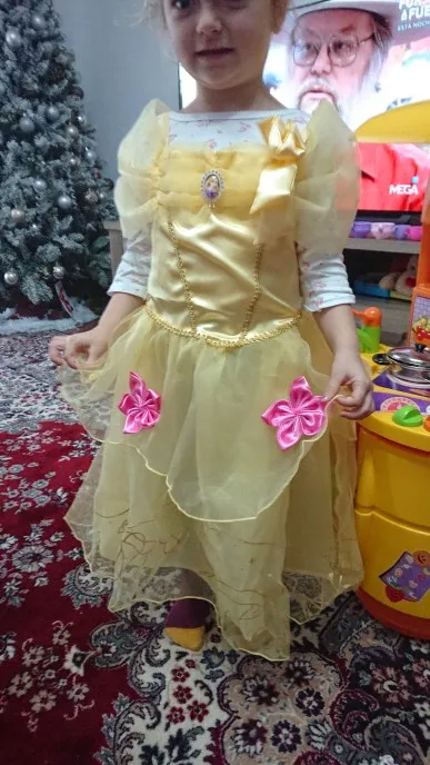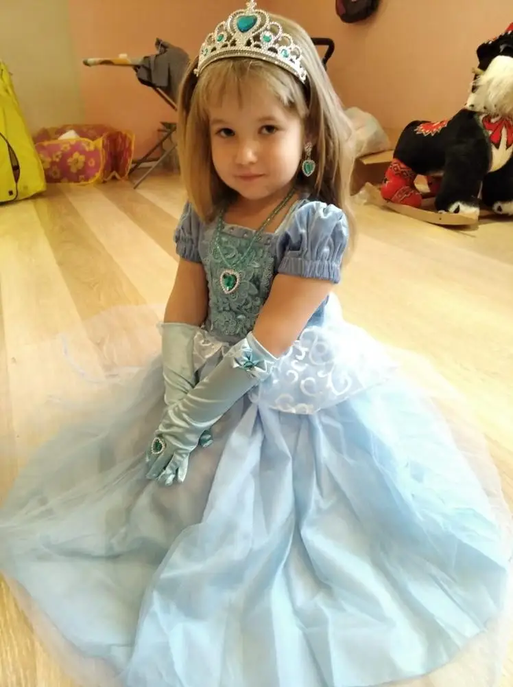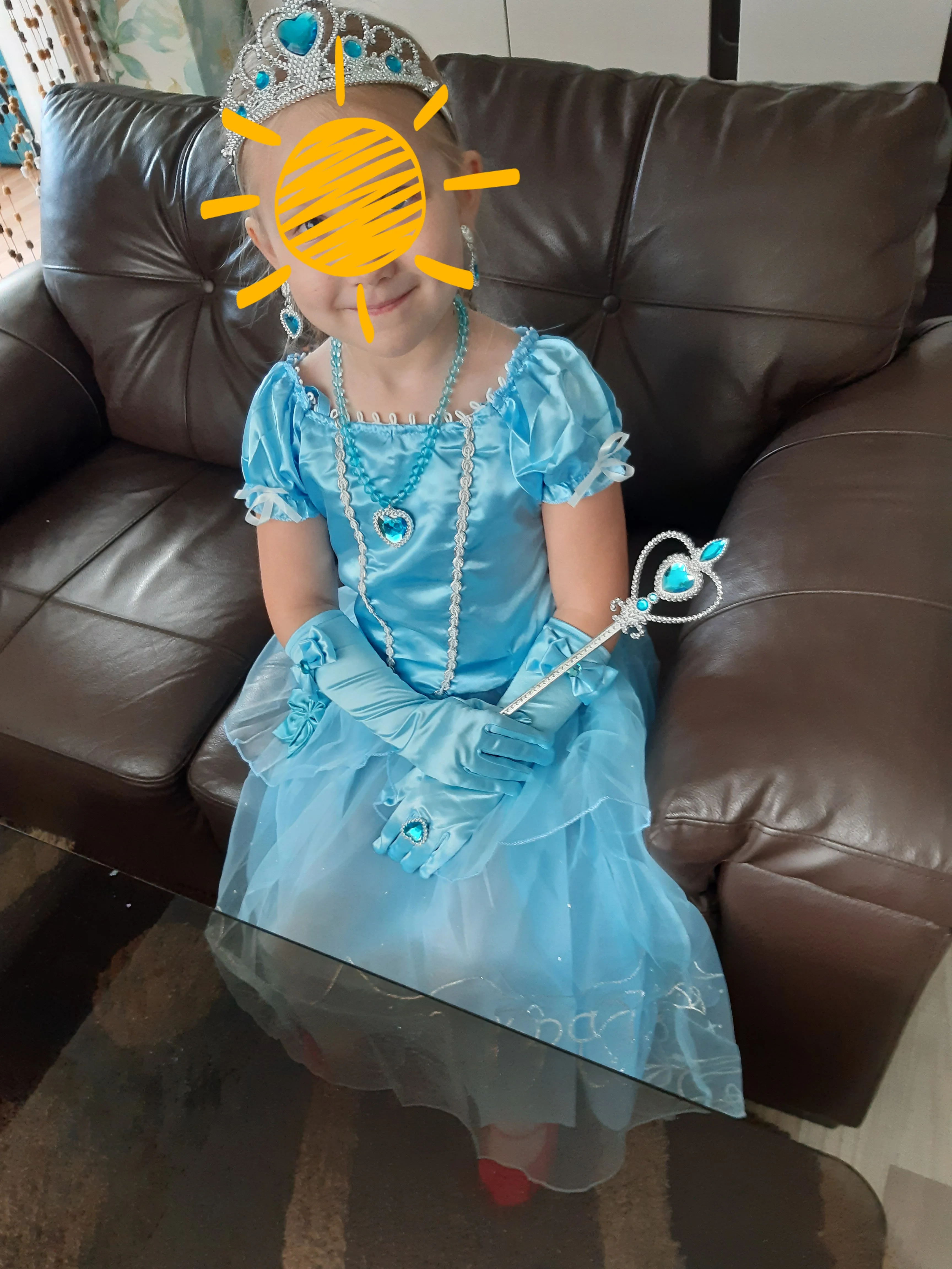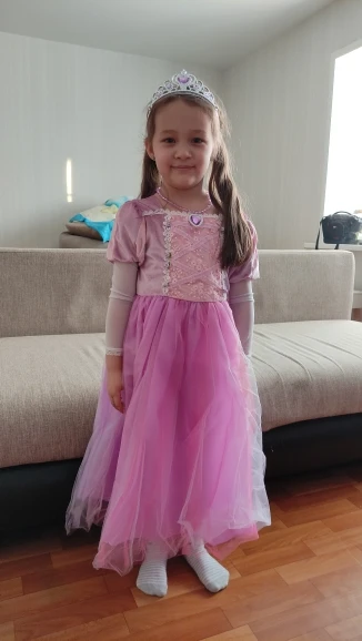 Обалденное платье за свои деньги. Правда я промахнулись с размером, заказала на 5 лет 7. Подошью в ателье. Аксессуары все целые. Все продумано, колье на резинке, клипсы с мягкой застёжкой. В перчатки вложены бумажные вкладыши. Корона пристегивается к обручу. Не ожидала за такую стоимость такую красоту. Юбка, конечно, не такая пышная, как на фото. Верх из бархата, резинки в талии и на рукавах. Но ребенок доволен.