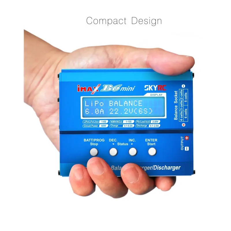 SKYRC B6 mini-это маленькая и усовершенствованная версия для известных IMAX B6. По сравнению с B6, он имеет новые функции и функции с его супер компактным размером. Меньший размер, больше мощности. По сравнению с B6 мощность и ток заряда на 20% выше. Пользователи могут подключить B6 mini к ПК для управления ПК и обновления прошивки. Более того, пользователи также могут использовать его в качестве литиевого аккумулятора и внутреннего сопротивления аккумулятора.