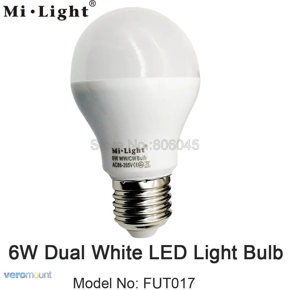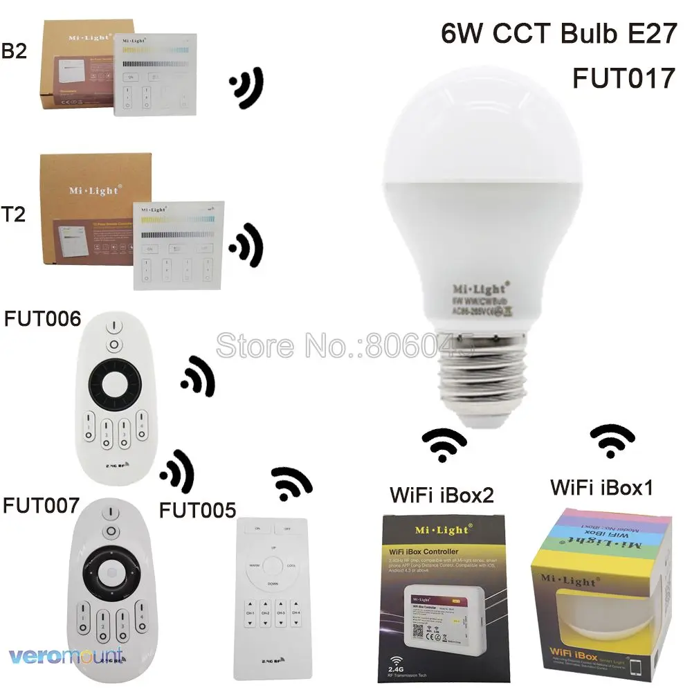 Светодиодная лампа MiLight E27, 6 Вт, регулировка температуры цвета, двойная белая лампа FUT017, 2,4 ГГц, пульт дистанционного управления, приложение AndroidiOs, Wi-Fi