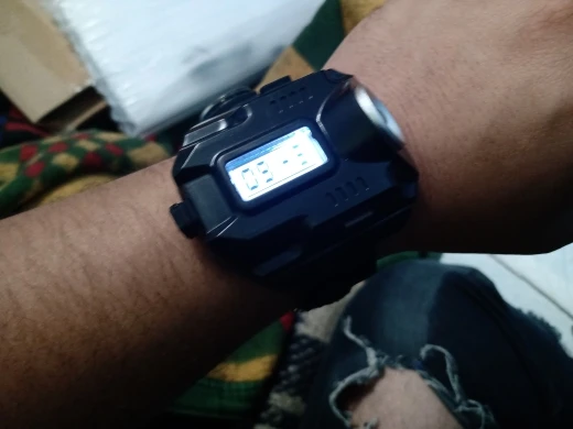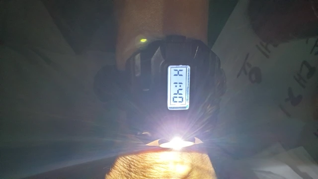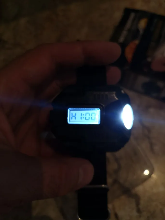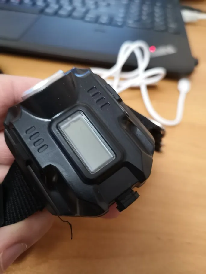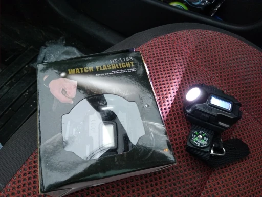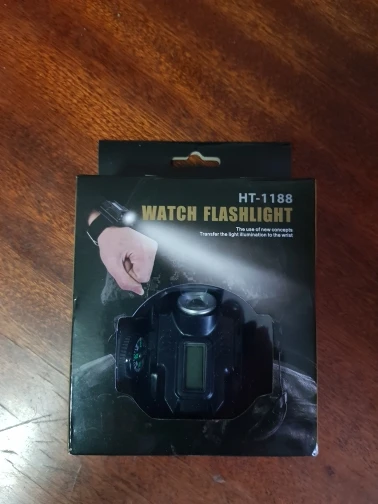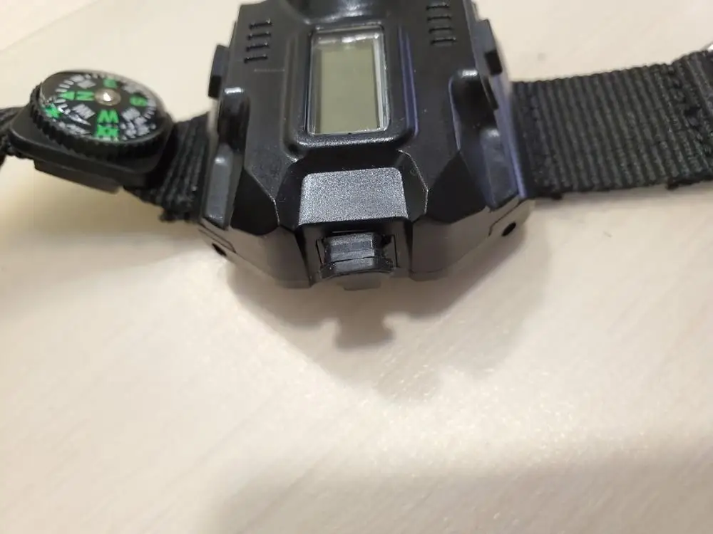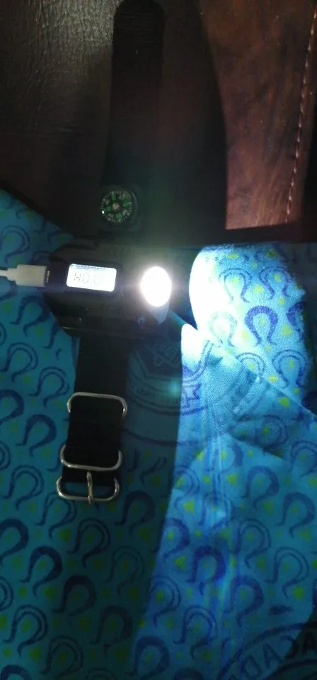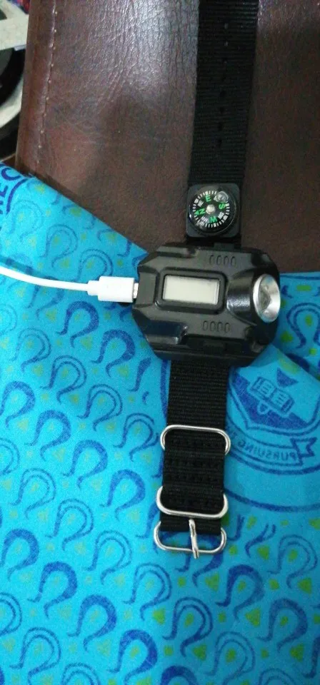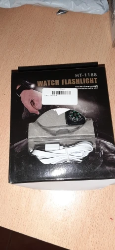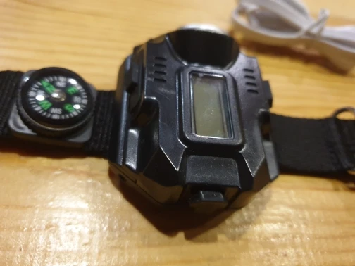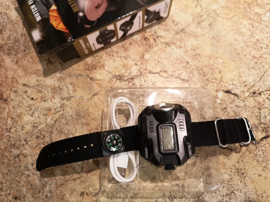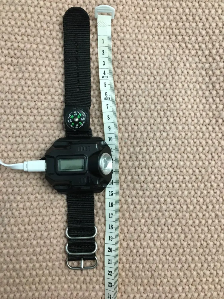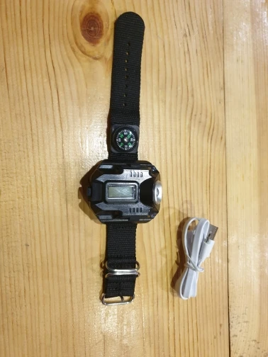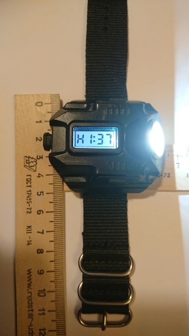 Отличные часы-фонарик. Пришли очень быстро. Длина 6 см., ширина 5см., толщина 2,5 см. Удобный тканевый ремешок. Много отверстий для регулировки длины и два овала из металла для заправки ремешка. Кнопки в резиновых чехлах. Заглушка для зарядки держится плохо, отваливается, скорей для видимости и будет пропускать воду. Верхняя кнопка при нажатии яркий свет и на экране Н 1:40 - время работы при таком свете. При следующем нажатии фонарик светит чуть тусклее, но тоже хорошо и на экране L 8:00 - время работы при таком свете. Нижняя кнопка при одном нажатии - часы. Второе нажатие - месяц, дата. Часы идут точно. Отключаются через 3 секунды. При одновременном нажатии верхней и нижней кнопки фонарик вспышками загорается SOS. Учитывайте при покупки, что часы могут не влезть под манжет рубашки-очень толстые. Компас плохого качества с пузырьком воздуха и протекает - выкинул.