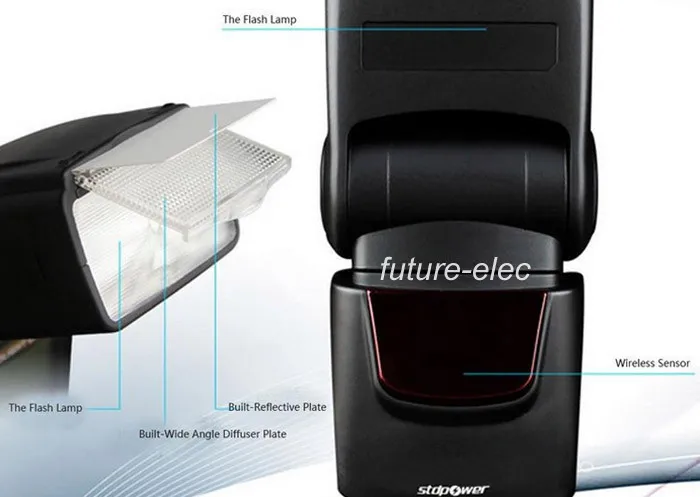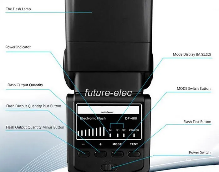 Высококачественный беспроводной датчик позволяет камере запускать вспышку на дальнем расстоянии.С режимом вспышки M, S1,S2.Супер скорость зарядки утилизируется. Это занимает всего 3 секунды, чтобы закончить цикл зарядки после полного выхода уровня.DF-400 имеет встроенную широкоугольную диффузию и отражатели для макросъемки, которая нуждается в мягком флэш-светильник.Стандартный внешний разъем питания Canon и стандартный синхронный порт ПК (вход) соответствуют вашим требованиям к быстрой вспышке.8 уровней управления яркостью вспышки и автоматической функции энергосбережения.Встроенная память для сохранения.С мини-подставкой и сумкой для переноски.С универсальной hotshoe, подходит для почти камеры, за исключением Sony и Minolta.