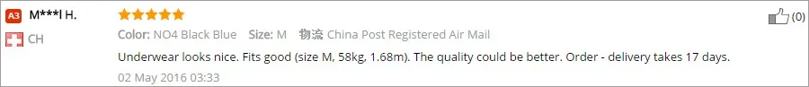 Общением доволен, описание точное, с продавцом не общался, трусы не получил. Последние данные: прибыли на таможню. Похоже сотрудникам данной богадельни они нужнее оказались!