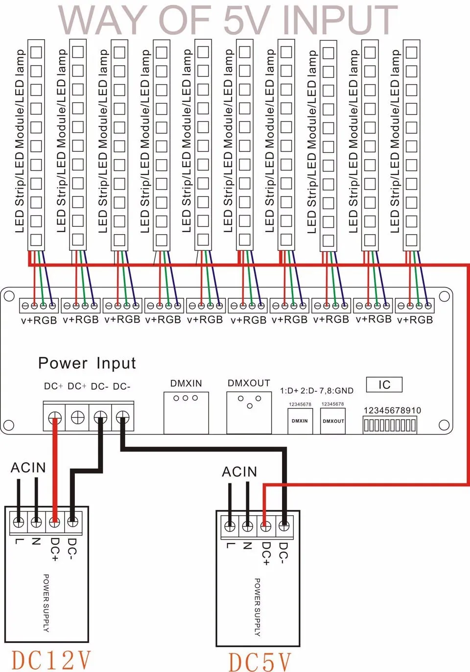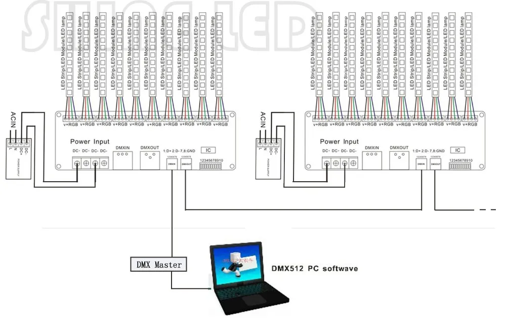 Лампы RGB0-100% выход затемнения, каждый канал 256 серых уровнейМеждународный стандарт DMX512 входной протокол, адрес