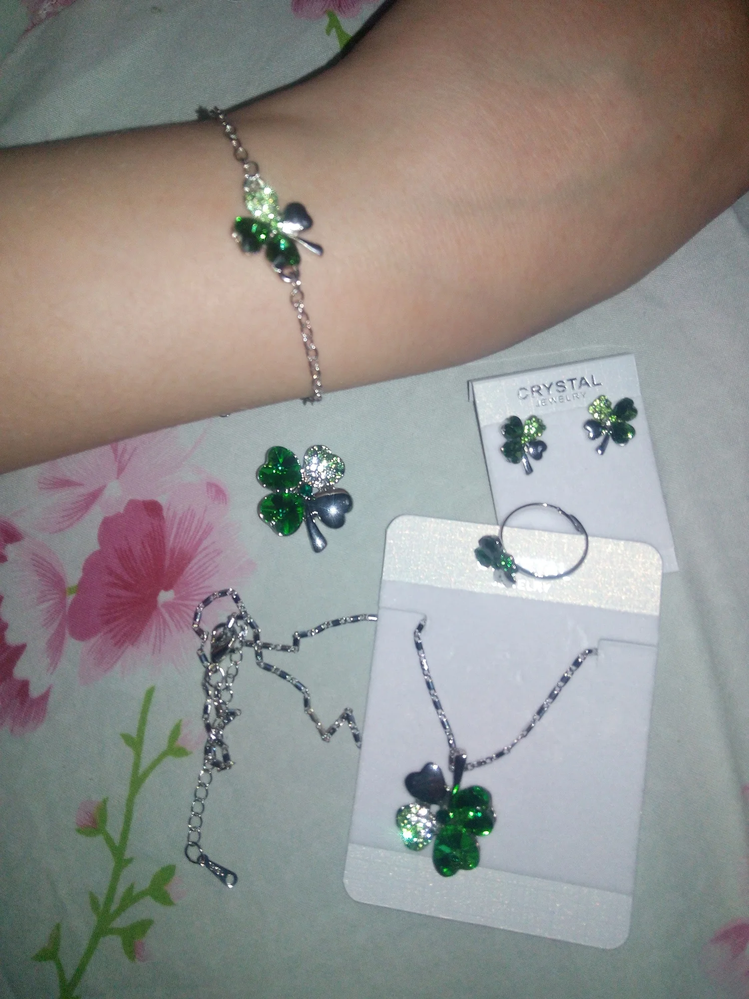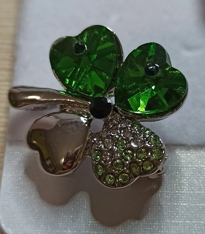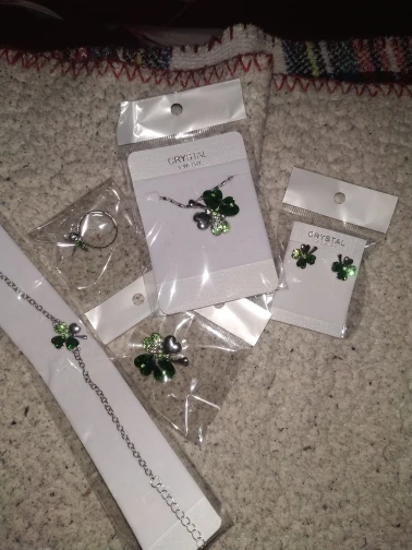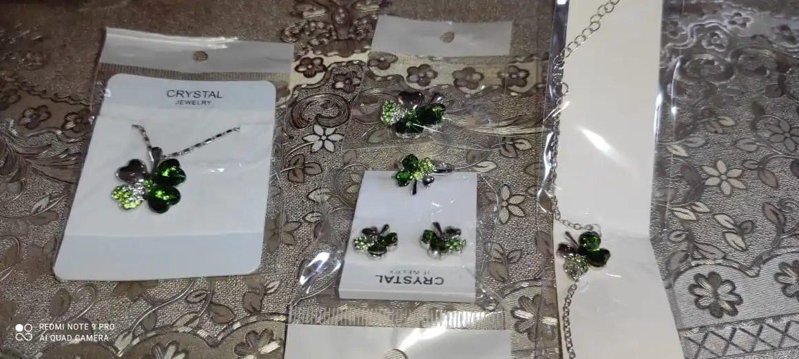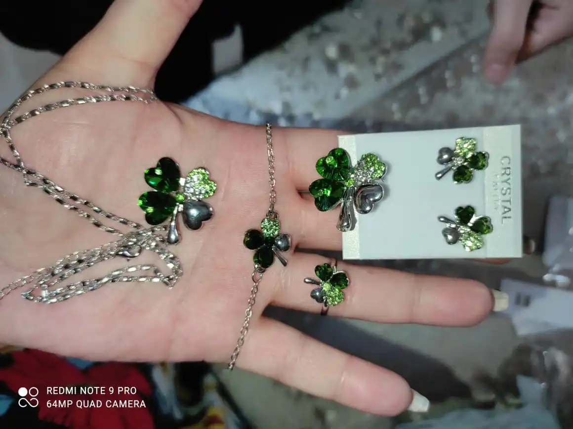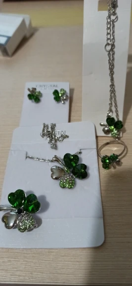 Набор очень красивый, четырёхлистнки некрупные, смотрятся аккуратно и красиво. Немного заедает замок у броши и царапалось кольцо, но муж помог и теперь всё хорошо. За такие деньги отлично.