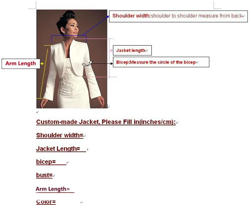 B. Размер1. Полная Бюст: _ дюйма или сантиметры 2. Талия: _ дюйма или сантиметры 3. Длина руки: _ дюймов или сантиметров 4. Бицепс: _ дюймов или сантиметров 5. Ширина плеч: _ дюймов или сантиметров 6. Длина куртки: _ дюйма или сантиметра