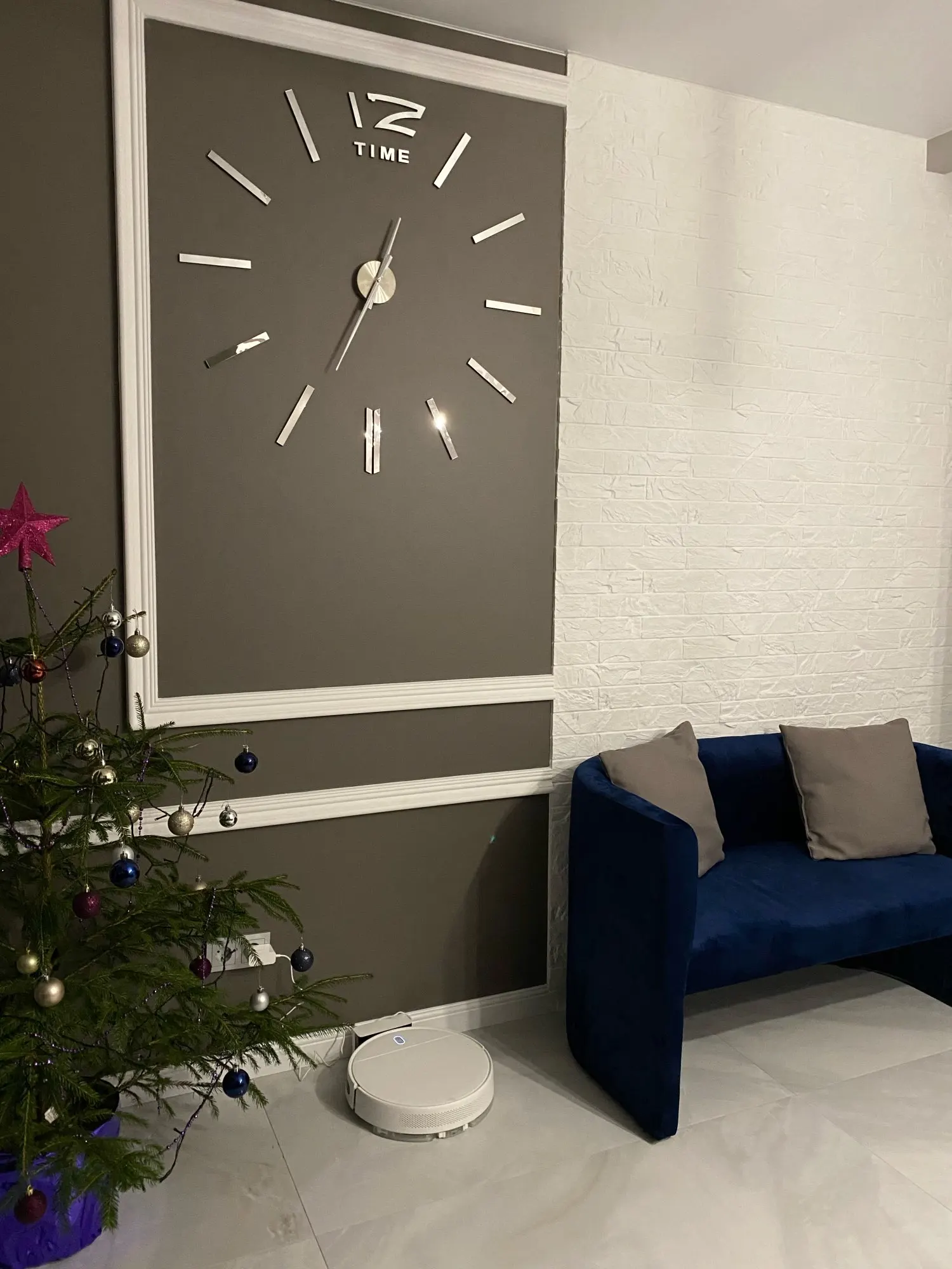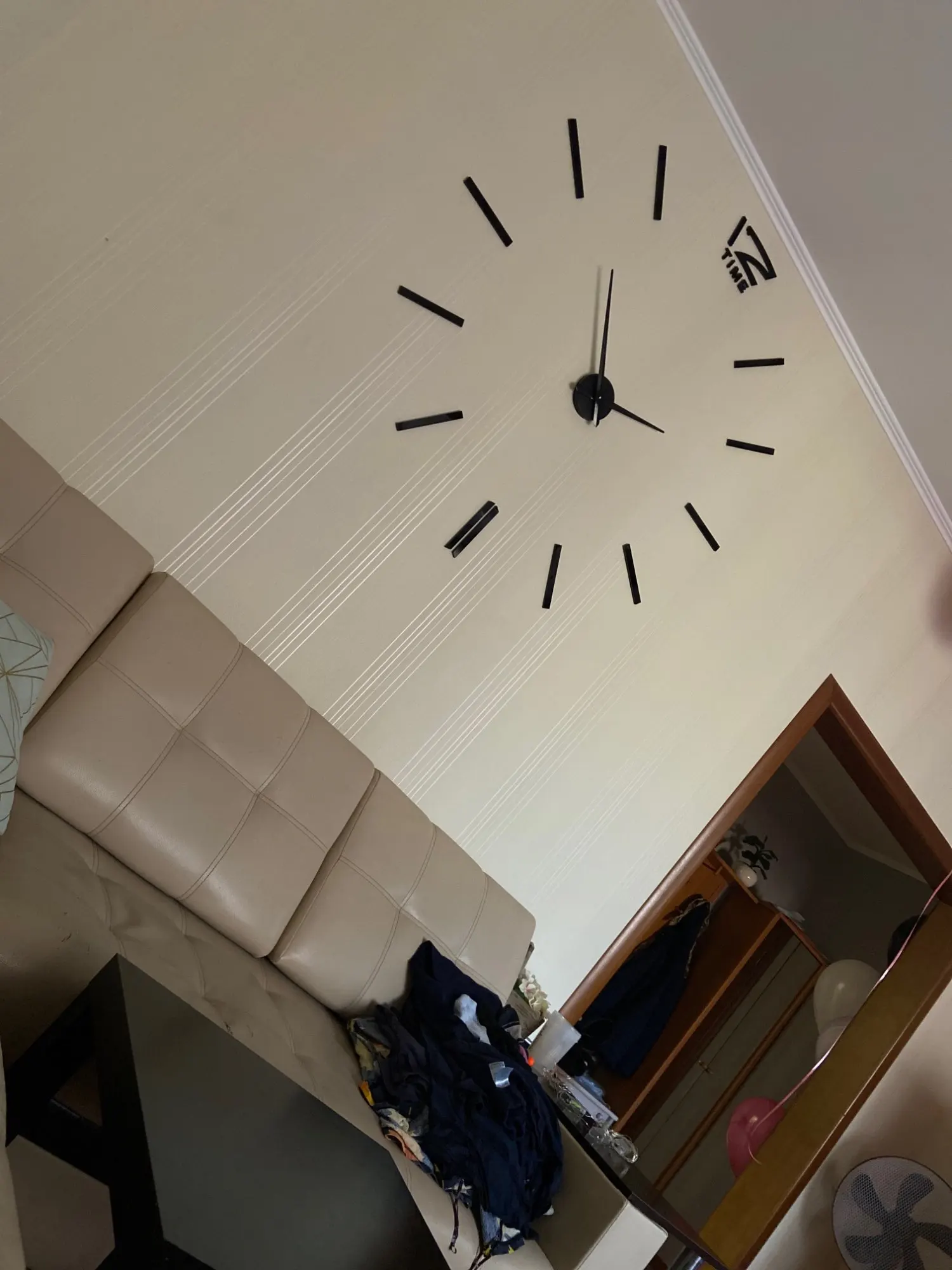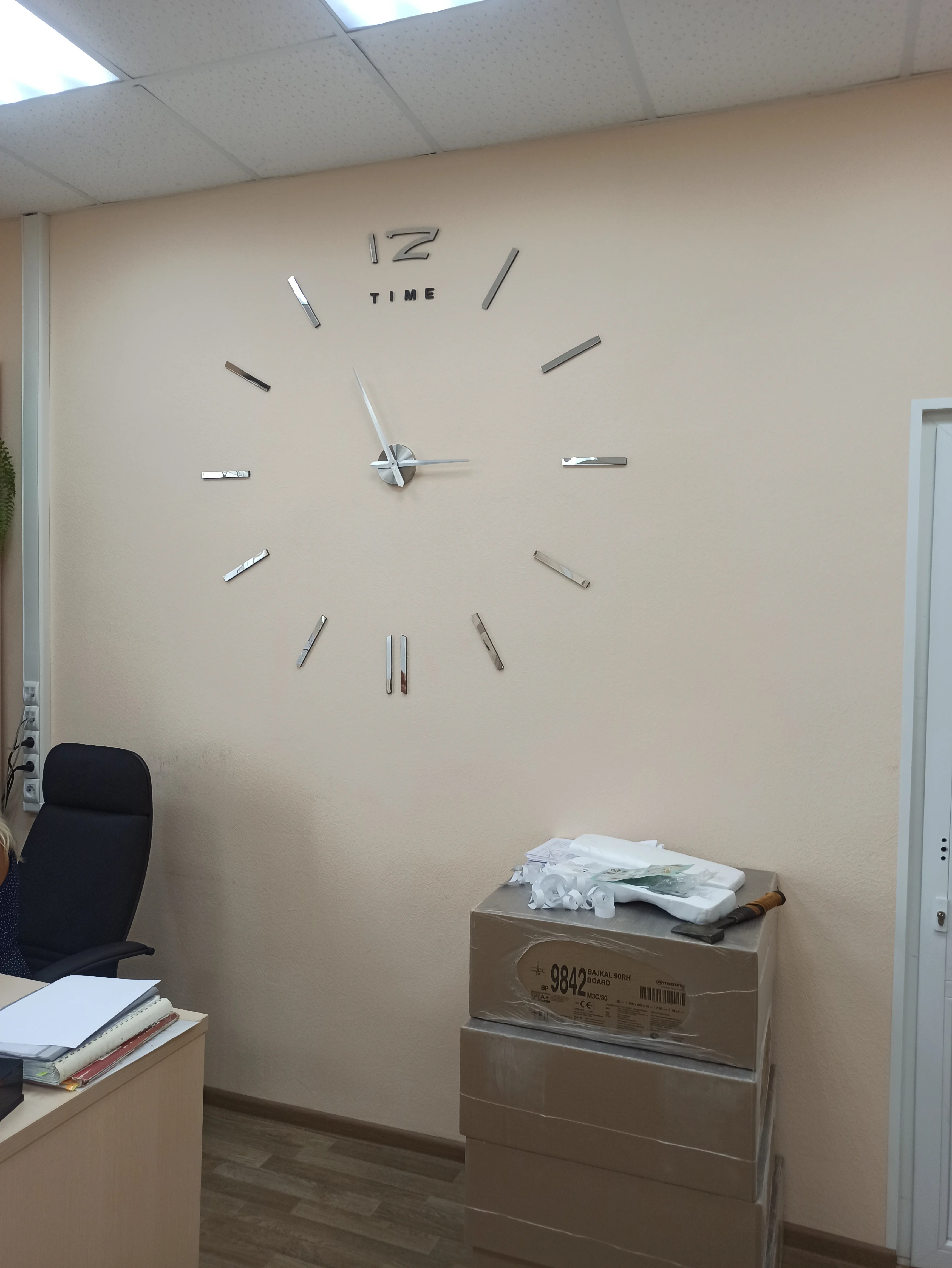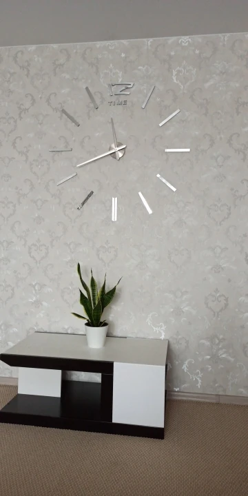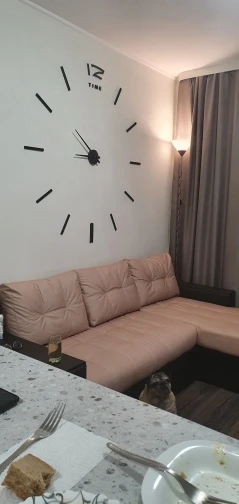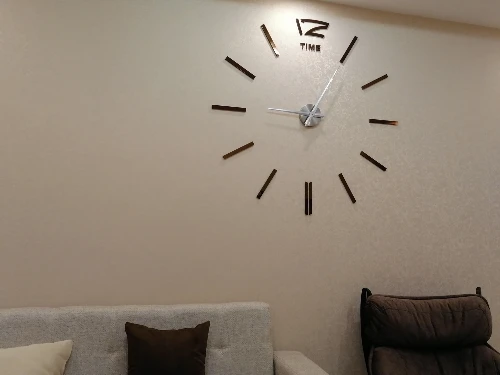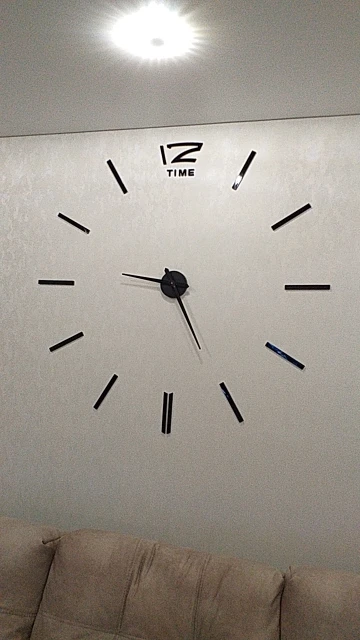 Дошло за пару недель. Коробка хорошо упакована, не помято ничего, все запчасти имеются. Супер часы. Стильные, ничего лишнего. В дизайн вписались на ура!!! Вешать удобно, инструкция прилагается, мне помог ещё уровень в дополнение. 47' реально на всю стену!!! По трафарету цифры повешаны на 55см от центра, на мой взгляд, это оптимально, но можно ближе и дальше, что сделает немного еще их больше или меньше... Диван на фото 2,55м для понимания! Спасибо продавцу, твёрдая 5!!!