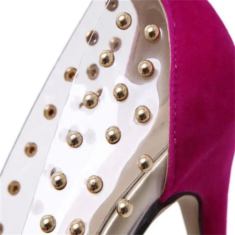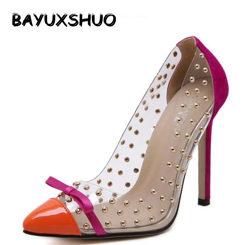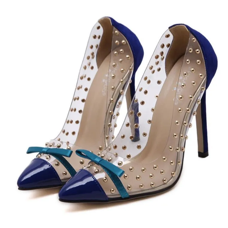 Женские Фетиш насосы на высоком каблуке с заклепками; Прозрачные туфли на высоком каблуке; Брендовая обувь с острым носком; Sapato Feminino; Большие размеры