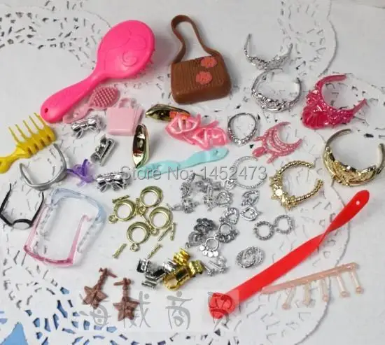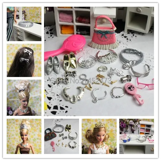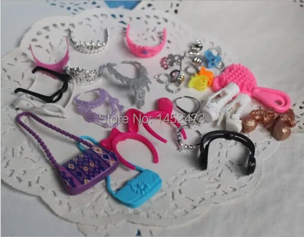Аксессуары для кукол Барби, 20 шт. (сумки, очки, ремни, короны, колье, расчески, обувь, шпилька, серьги, браслет)