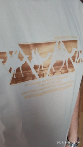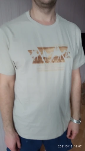 Футболка классная. На российский сорок восьмой размер подошёл размер L. Ткань натуральная , хб. Рисунок принта тоже очень нравится, видно, что качественный и после стирки не сотрётся. Заказывайте, не пожалеете.