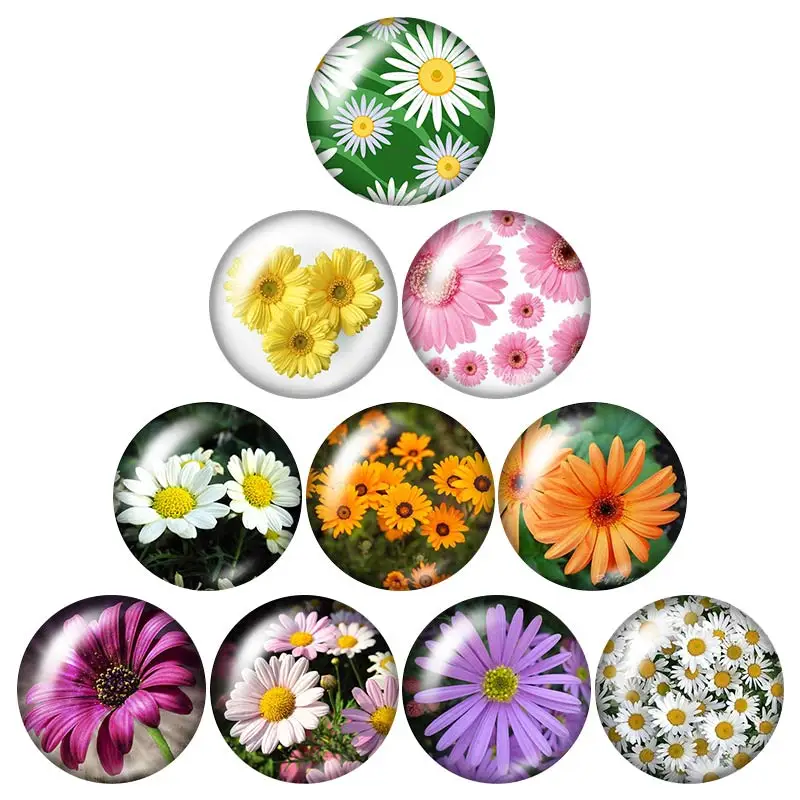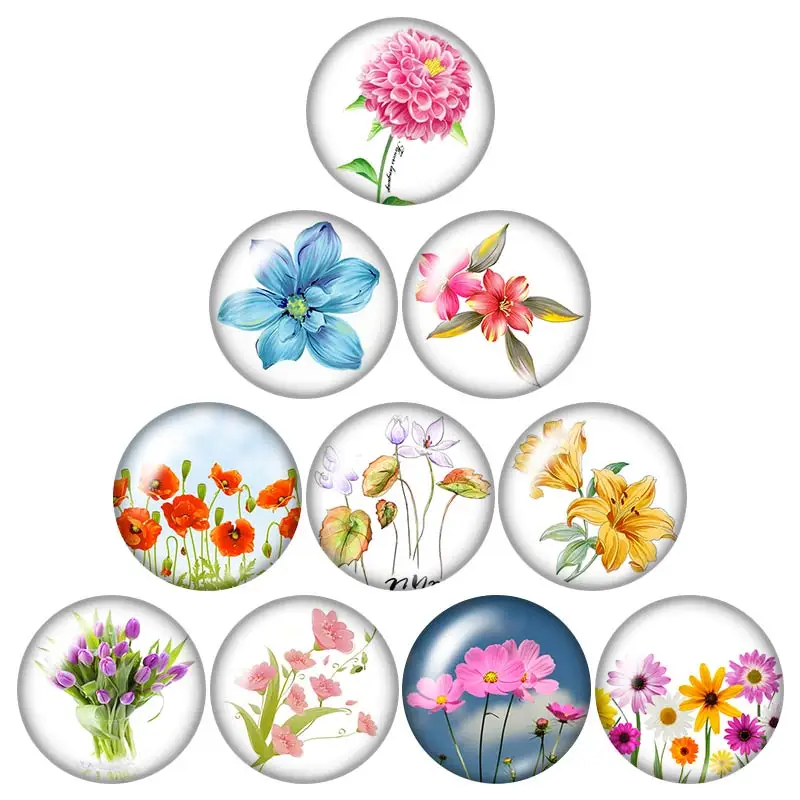 Пуговицы круглые разные, 18 мм, с кабошоном, с изображением цветов, роз, маргариток, лилий, 10 шт.