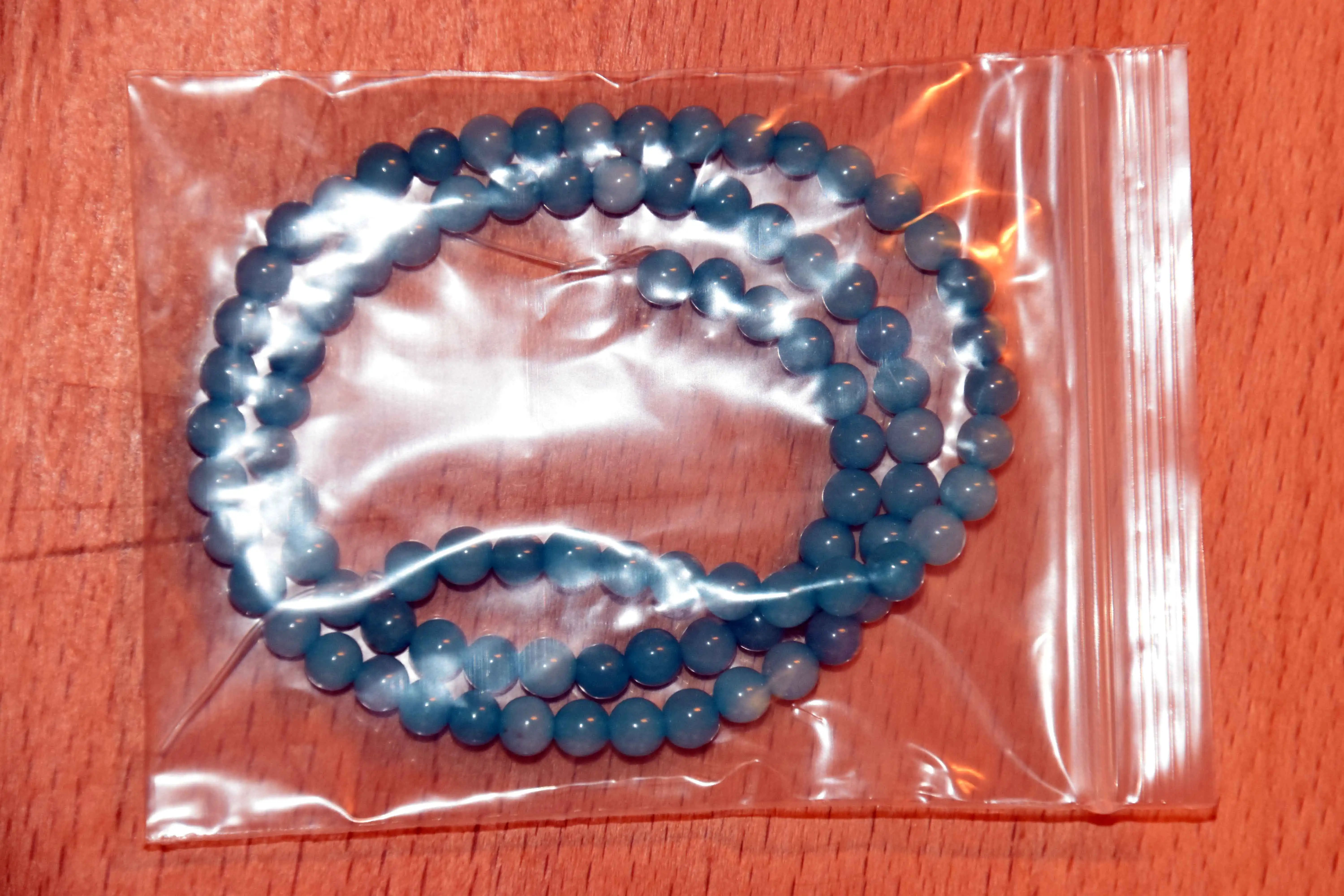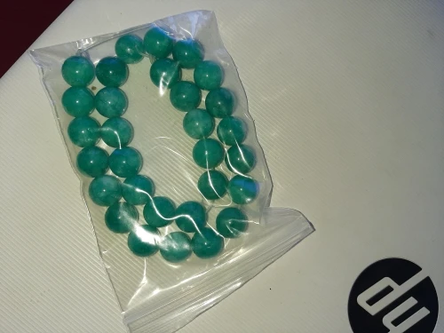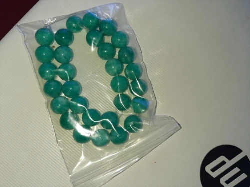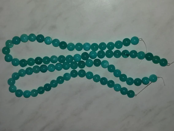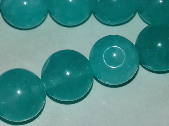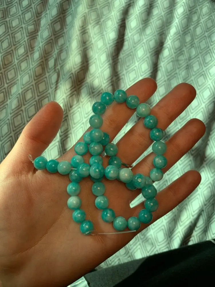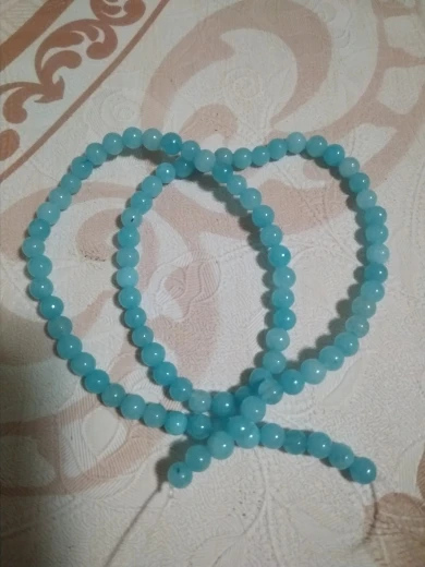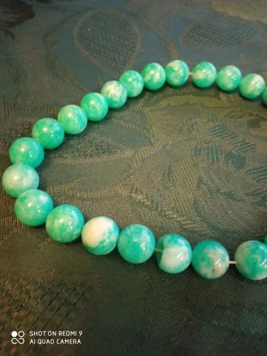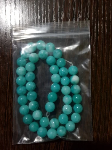 Бусины понравились. Цвет мятно-бирюзовый, неоднородный, на некоторых бусинах виден внутрений слоистый блеск. Цвет соответствует фото продавца, мои фото сделаны вечером при искусственном освещении. Пришли за три недели. В целом я довольна, но одна бусина с довольно заметным сколом, и еще на одной - странная потертость, но оценку снижать не буду. На ощупь камни холодные, приятные, надеюсь соорудить из этой нитки бусики или браслет!