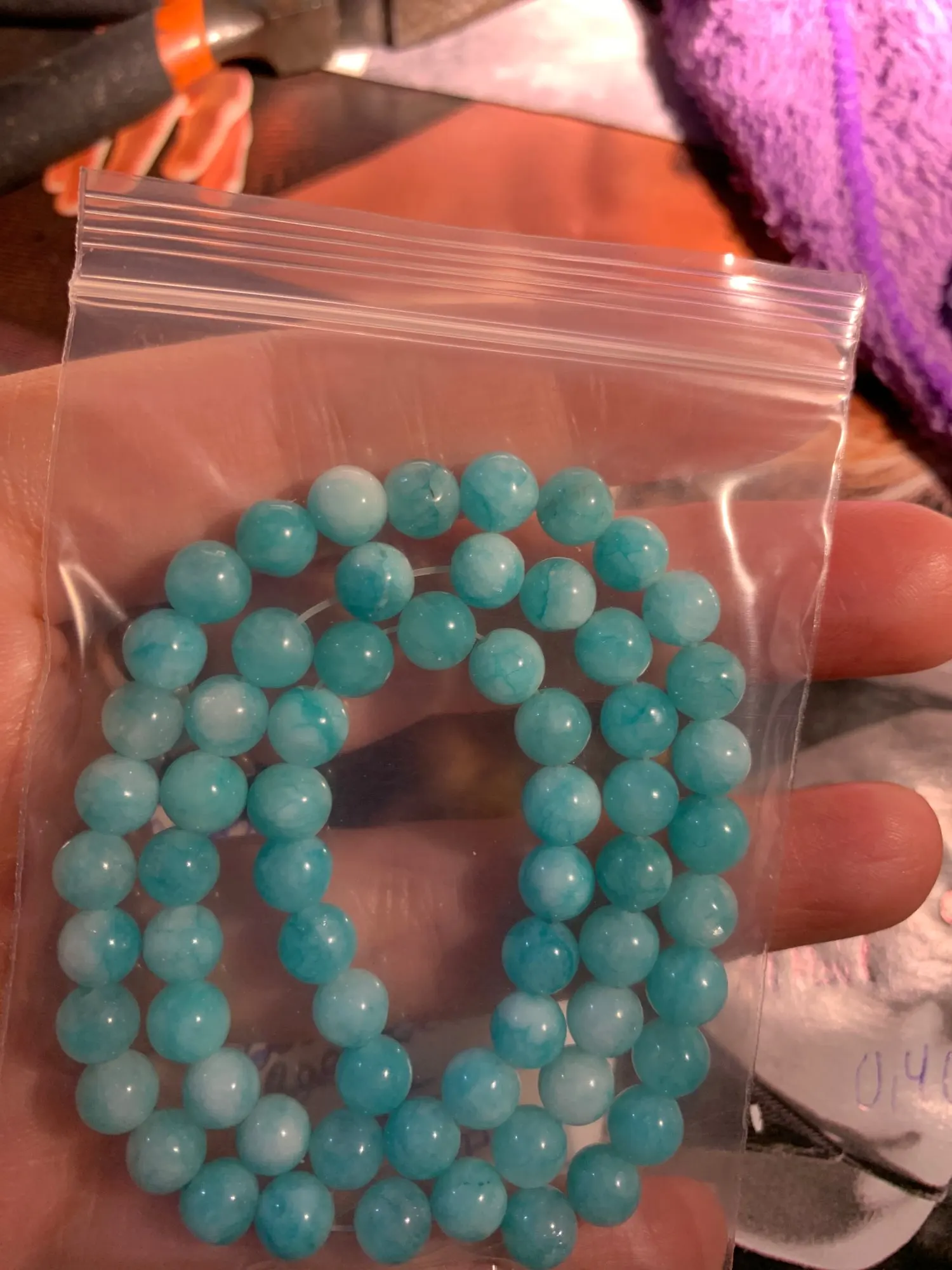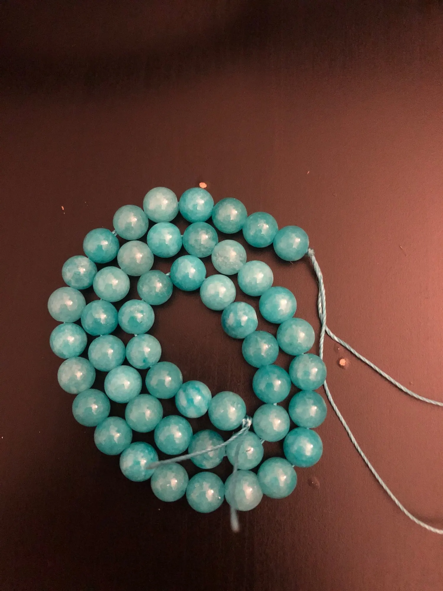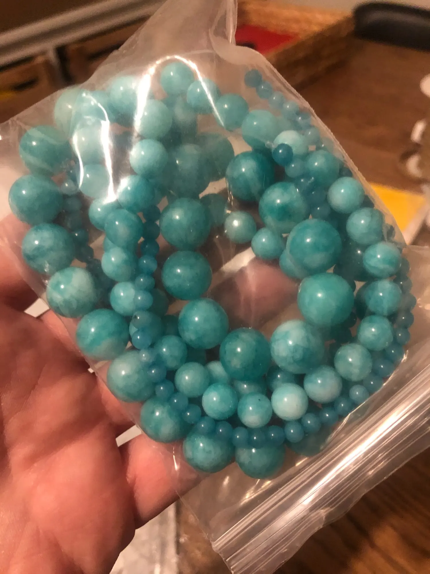 Бусины понравились. Цвет мятно-бирюзовый, неоднородный, на некоторых бусинах виден внутрений слоистый блеск. Цвет соответствует фото продавца, мои фото сделаны вечером при искусственном освещении. Пришли за три недели. В целом я довольна, но одна бусина с довольно заметным сколом, и еще на одной - странная потертость, но оценку снижать не буду. На ощупь камни холодные, приятные, надеюсь соорудить из этой нитки бусики или браслет!