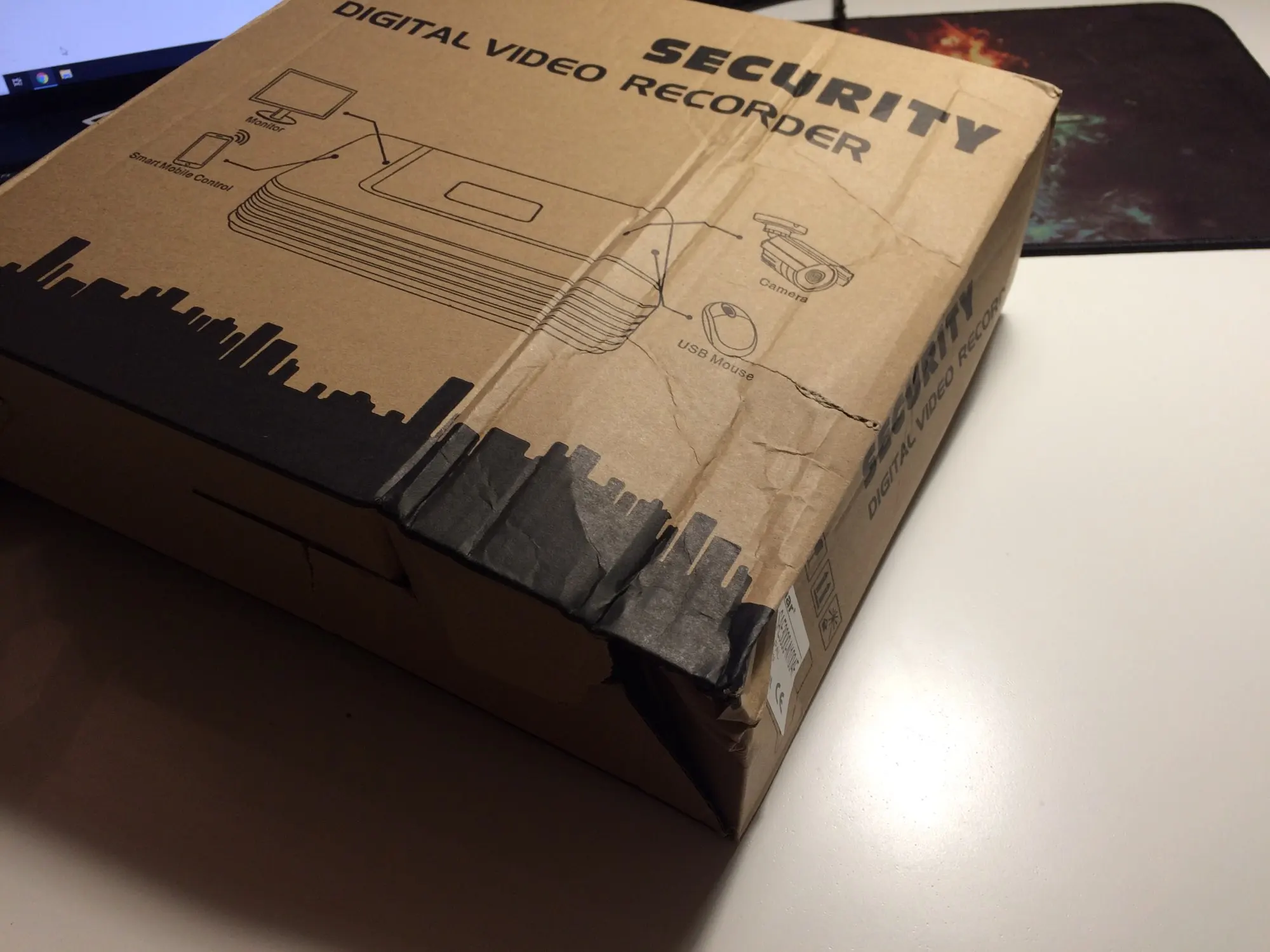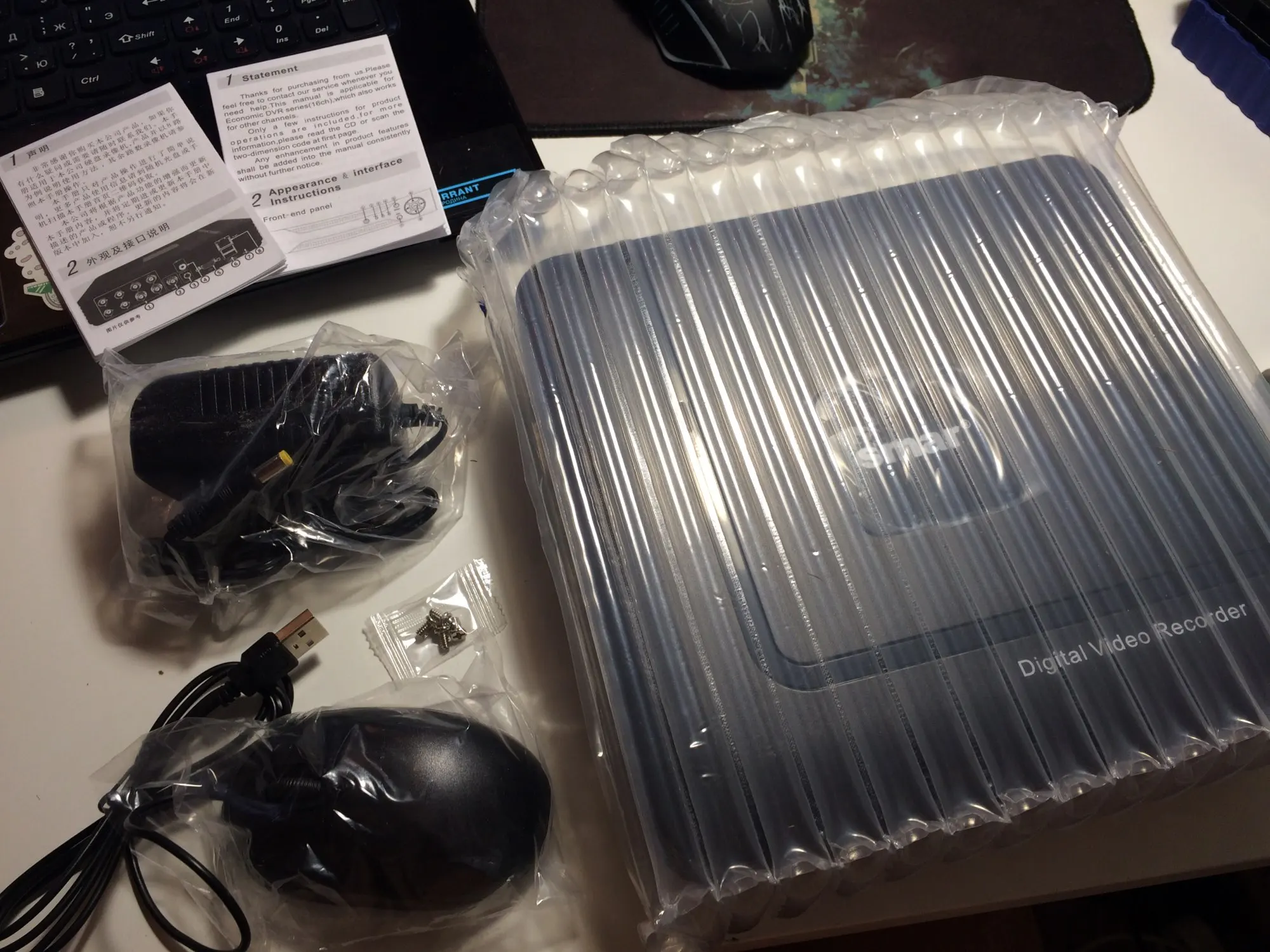 Пришёл быстро 11 дней и забрал в пункте выдачи. Коробка помята - спасибо почта. Сам товар упакован отлично. В комплекте мышка и блок питания, инструкции на китайском и английском. Придут камеры - проверю в эксплуатации.