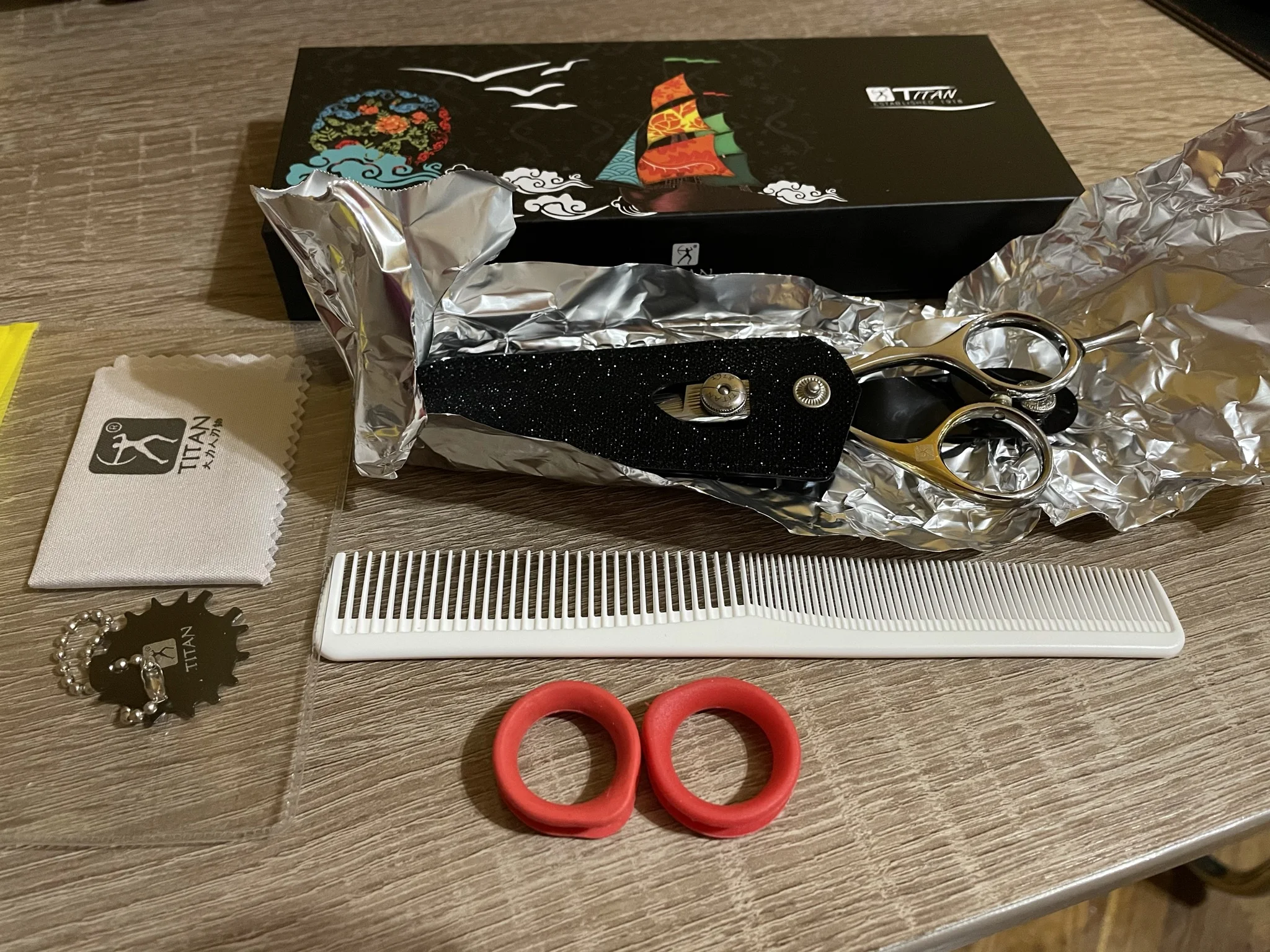 Получила свой заказ очень быстро, за 11 дней приехали в Киев. Была не приятно удивлена тем, что ножницы были завернуты в жесткую алюминиевую фольгу. Глянцевая часть ножниц была с микро-царапинами (потертостями), так же как и внутренняя часть коробки. На качество роботы конечно это не влияет, но все-таки не приятненько особенно если брать на подарок. По поводу эргономичности - спорный вопрос, ножницы явно не для людей с толстыми пальцами, но мне подошли. В целом понравились, снижать оценку не буду, надеюсь мой следующий заказ будет в лучшем состоянии.