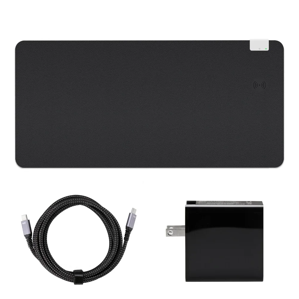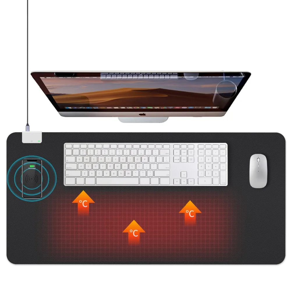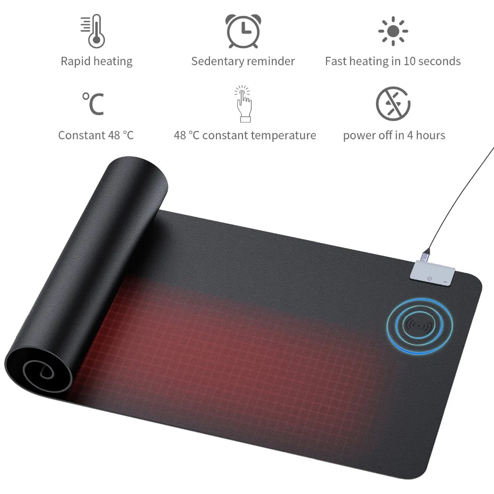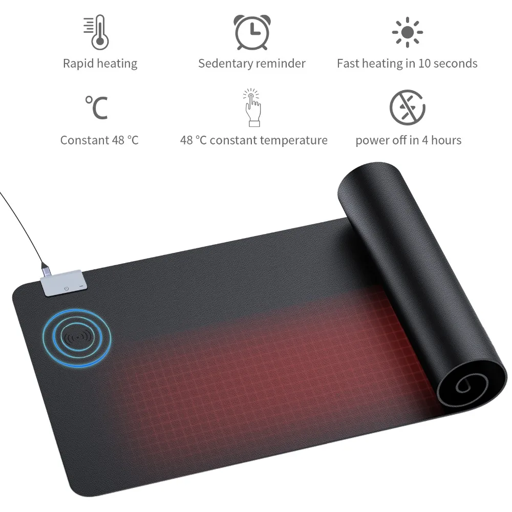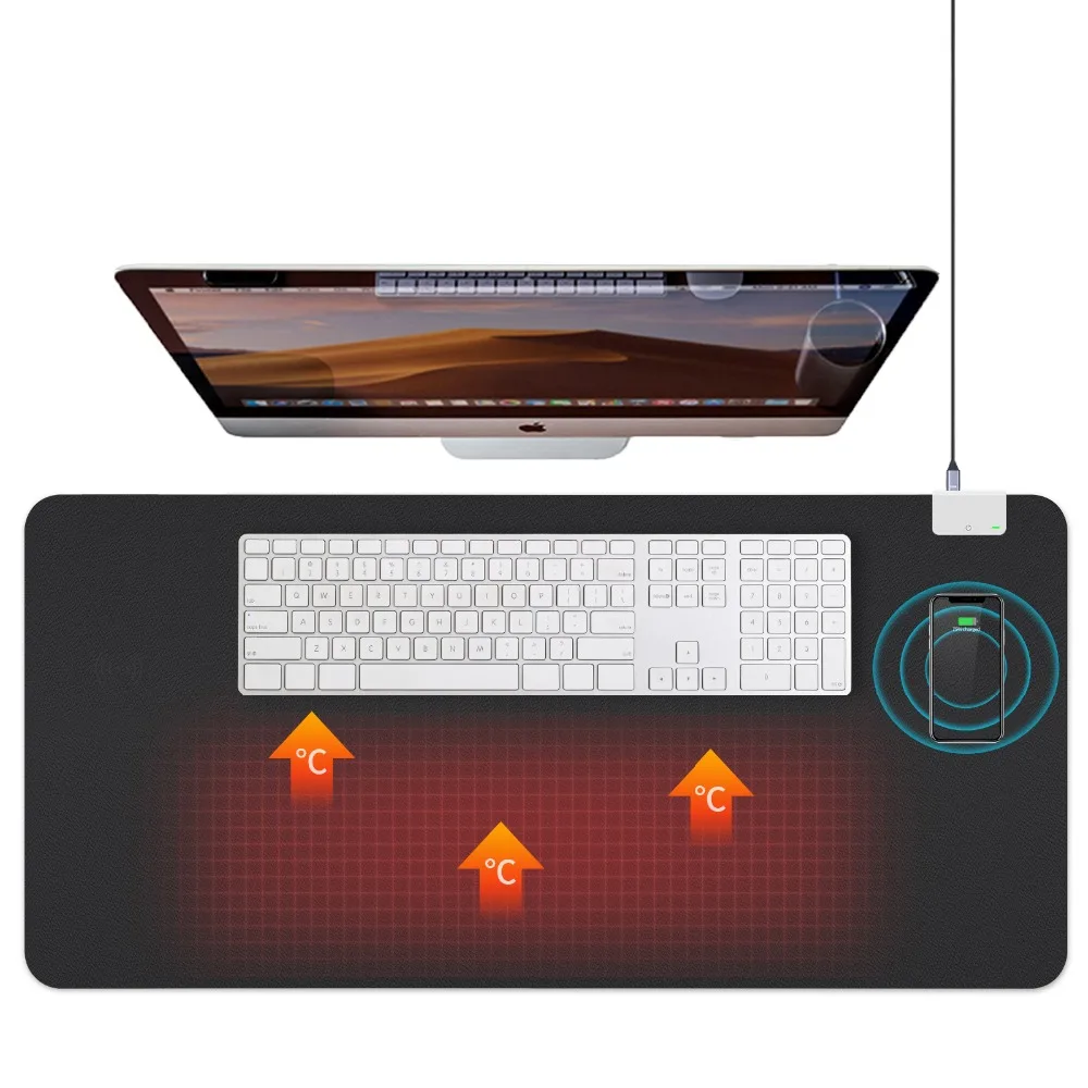 Особенность:1. 3 в 1 Многофункциональный беспроводной зарядный коврик для мыши/настольный коврик с функцией подогрева. [зарядное устройство мобильный телефон + грелка для рук + коврик для мыши]2. Изготовлен из искусственной кожи, комфортный на ощупь.3. Поддержка беспроводной зарядки Qi.4. Со светодиодным индикатором.5. Подходит для зимы в домашнем использовании или офисе.6. С зарядкой в левой или правой стороне на выбор.7. С адаптером PD 65 Вт и кабелем PD 100 Вт 2 метра и руководством пользователя.Спецификация:Цвет: черныйМатериал коврика: из искусственной кожиРазмер настольного коврика: 900*420*5 мм/35,4*16,7*0,196''Выход: 15 ВтВход: 20 В/3,25 АНоминальная мощность: 15 ВтРасстояние приема заряда: ≤ 6 ммДлина зарядного кабеля: 2 мИнтерфейс кабеля: двойной Type-CЗарядный адаптер: PD 65 Вт со спецификацией США или ЕС.Мощность нагрева: 35 ВтРазмер площади обогрева: 52*22 смСовместимая модель: поддержка без задней вставки моделей телефонов (для Samsung S6, S6edge, S7, S7gdge, S8, S8 + note 8,S9,S9 +,S10,S10 +; Для iPhone12, SE, 8, 8P,X,XS ,i11,11pro, AirPods2, AirPods Pro, Huawei P40 и другие мобильные телефоны QI)Зона зарядки слева:
