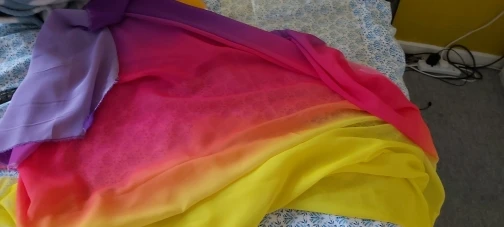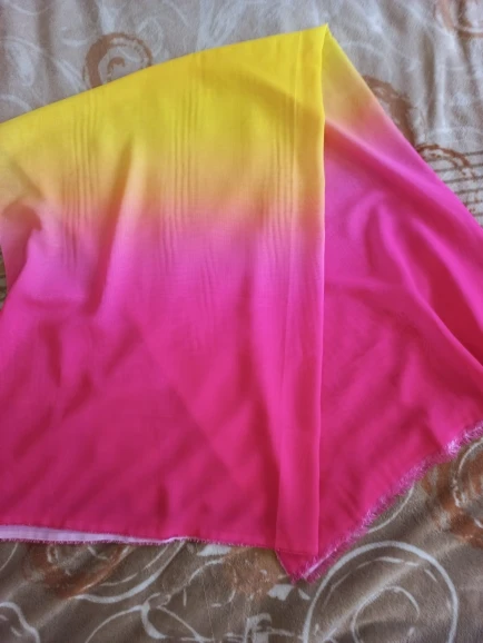 Цвета флуоресцентные по сравнению с изображением, а градиент немного жестокий. Кроме того, это не шелк, а полиэстер. В отличие от рекламы