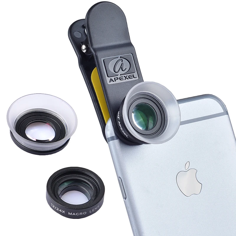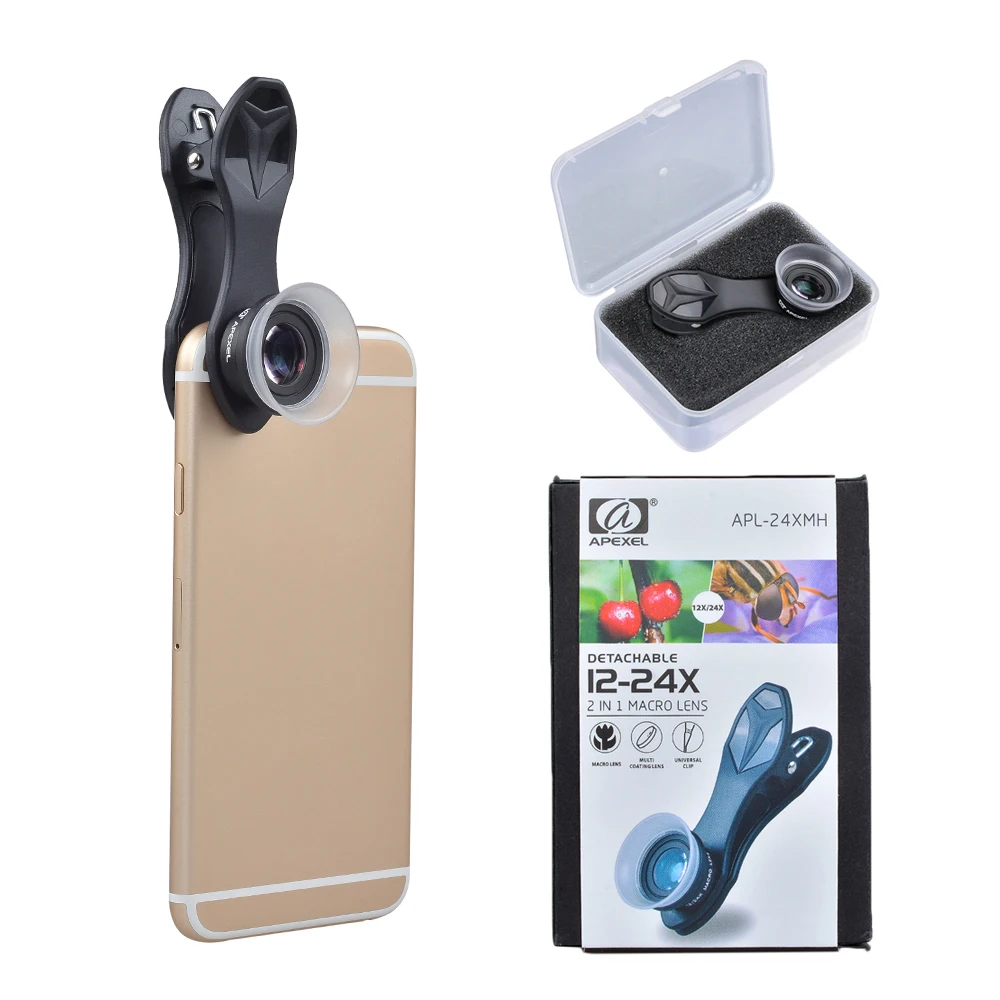 Широкоугольный макрообъектив APEXEL для мобильных устройств, алюминийстекло, 24X, универсальный, с зажимом