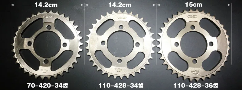 428 - 34T: толщина 7 мм; Расстояние между отверстиями для винтов 70 мм; Апертура для фиксированных винтов 8 мм