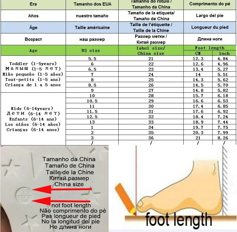 1. Сначала Измерьте длину стопы вашего ребенка линейкой, затем выберите правильный размер в соответствии с приведенной выше таблицей размеров по длине стопы. Например, если у ребенка длина стопы 12,6 см, вы можете выберите Размеры 22. Если у ребенка полные ступни, вы можете выбрать на один размер больше, чем обычно.