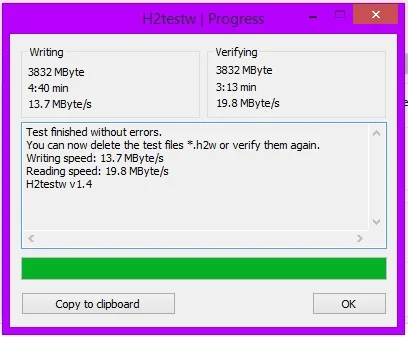 Обычная маленькая хорошая флешка. Вот что вышло у меня в тесте: Warning: Only 15181 of 15182 MByte tested. Test finished without errors. You can now delete the test files *.h2w or verify them again. Writing speed: 8.48 MByte/s Reading speed: 18.6 MByte/s H2testw v1.4 Брал на 16Гб. Так и есть.