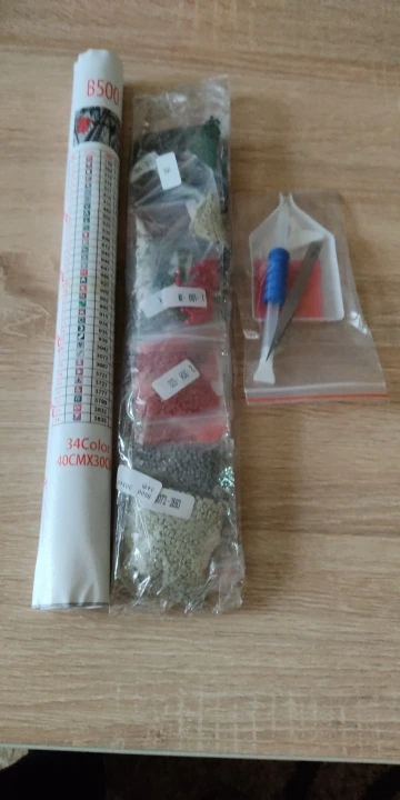 Получила посылку. Сама она шла меньше месяца, да на почте завалялась, причём, совсем на другом почтовом отделении. Но это не важно, разобрались. Уж не знаю, где и кто, но получила малость помятую. Само полотно не пострадало, было намотано на трубку, спасибо за это продавцу, рассыпался только один цвет алмазиков. Собрала, как могла. Надеюсь, хватит для выкладки, да и в запасе своих много есть, замену сделаю. Как выложу, покажу. Ещё, что не понравилось, размер картины меньше, чем заявлено. Сантиметра на 2 причём... Как искать под неё рамку после - не знаю..