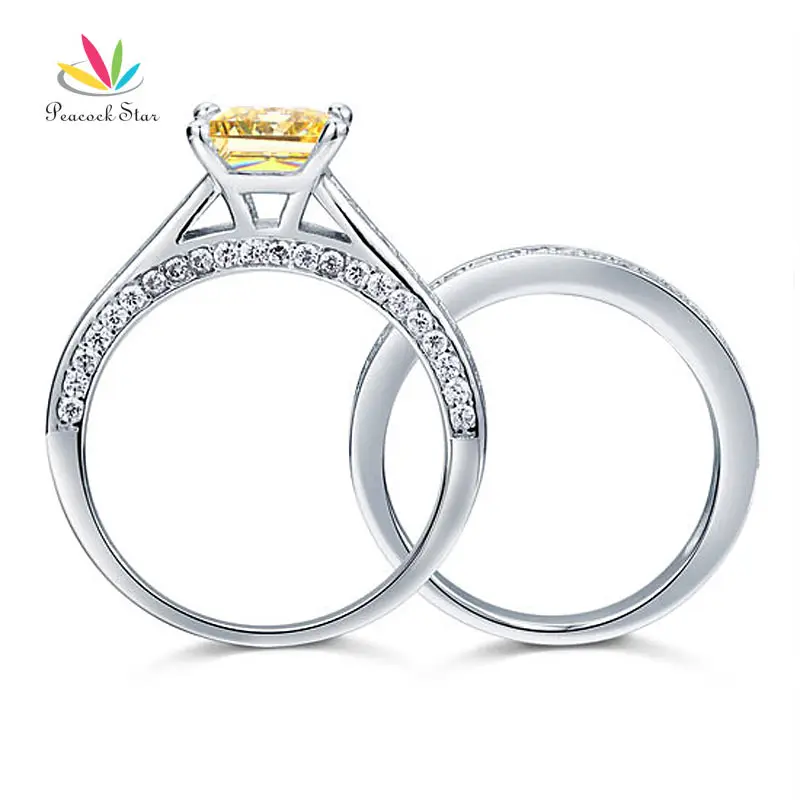 1,5 карат Принцесса Cut желтоого твердого стерлингового серебра 925 2-Pcs, кольцо для помолвки, свадьбы, комплект ювелирных изделий