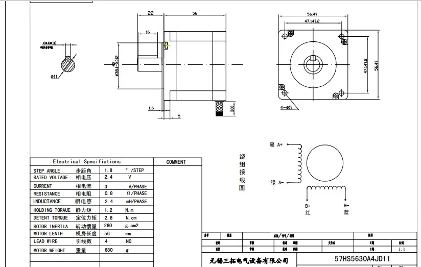 Размеры и проводка корпуса шагового двигателя nema23 56 мм:(Модель: 57HS5630A4JD11)