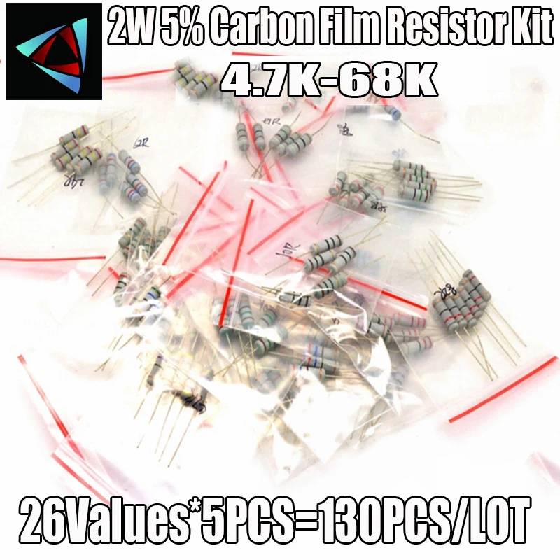 130 шт. 4,7 K-68K Ом 2 Вт 5% 26valuesx5 шт. карбоновый пленочный резистор, набор в ассортименте, пакет для образцов