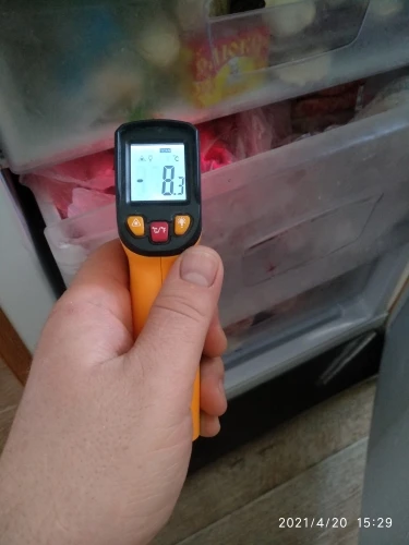 Работает, сравнить показания с эталоном нет возможности, проверял по кипящему чайнику, по морозилке. Наводил на ярко красный металл показал три восьмерки (у меня прибор до 600 градусов). Работает от двух мизинчиков.