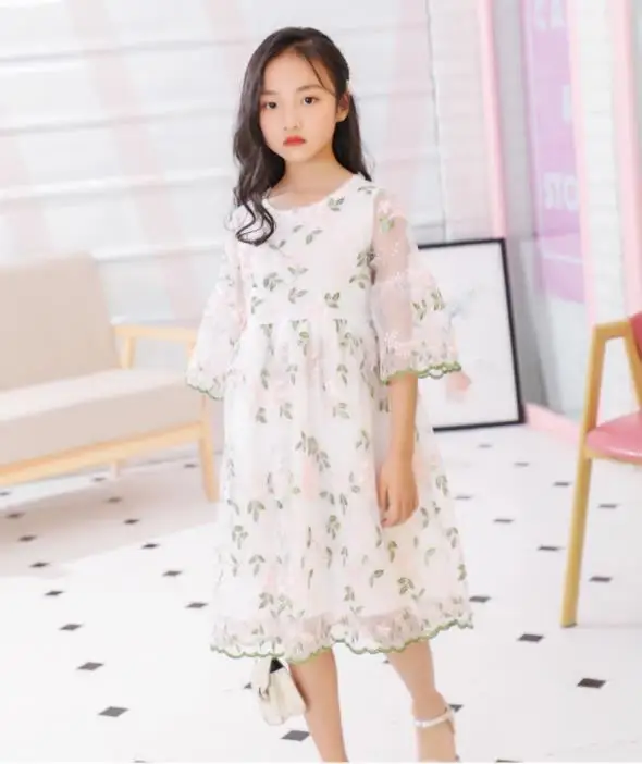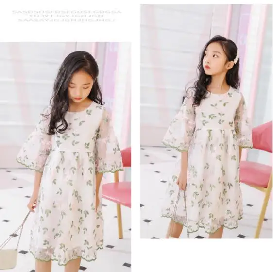 Платья для девочек, милое платье с высокой талией и вышивкой по кра...