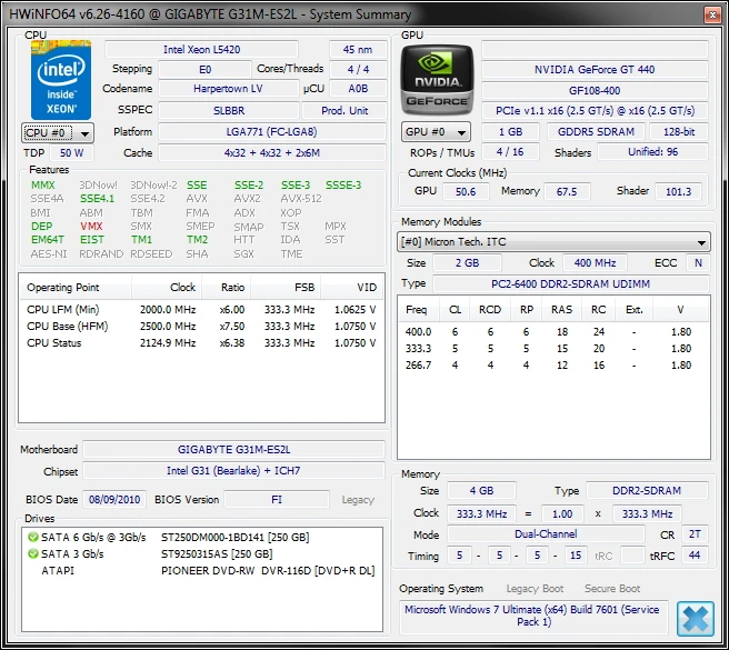 Оставался комп, неизвестно - рабочий или нет. Стоял Селерон и 2Гб памяти 1 планкой. Решил проверить работоспособность. Оказалось все рабочее. Ранее знал, что на 775 сокет можно ставить Зионы/ Ксеоны. Поискал информацию, не захотел менять кулер от Селерона, поэтому искал Зион, который бы мало грелся, чтоб кулер взять от Селерона. В итоге прошил биос и все заработало. Но это стоило нервов, так как у старых материнских плат свой биос. Все устаревшее, долго разбирался, потому что непривычно. Никогда раньше не имел дело с 775 сокетом. Но все хорошо. Прошил биос на материнке Gigabyte ga-31m-s2l v.2. На кулере от селерона на защелках греется в меру. Но в играх чере Msi afterburner показывают более высокие градусы. Например, в Аиде всего 50. А в Msi afterburner - 70 градусов. Не знаю, отчего так. Скрины стресс-тест Аиды.