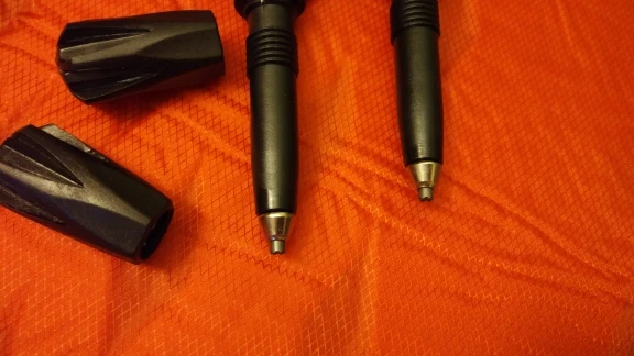 Первую пару мы с супругой использовали с середины июня. На удивление, палки лёгкие, крепкие и удобные. Регулировка по длине не сбивается. Как настроили под себя в июне, так и ходим. см фото. Сменные колпачки были в комплекте. Но уже появились следы истирания. Поэтому заказал дополнительные. Нынешний заказ - это уже подарок родным и друзьям (на фото упакованы). Палки рекомендую. Да! Амортизатора нет. Но мы брали именно такую конструкцию. Подписался на этот магазин. Продавец терпеливо отвечает на все вопросы. Спасибо за работу!