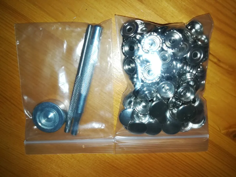 Пришло в хорошем состоянии. Пакетик с инструментом и металлическими кнопками.