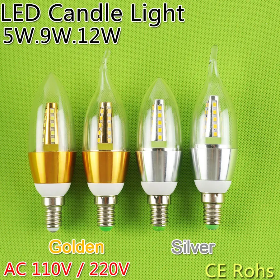 Лампа в форме свечи светодиодный E14 9 Вт 5 Вт Алюминий корпус Светодиодный светильник 110V 220V Светодиодный светильник E14 золотого, серебряного цвета холодный теплый белый Lampara Zarovka SMD 5730