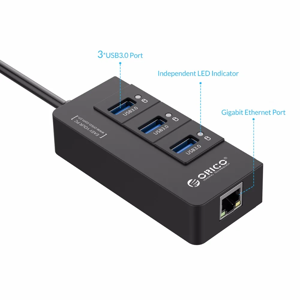 ORICO Бесплатная доставка USB 3,0 концентратор с внешней RJ45 Gigabit сетевой карты-черный (HR01-U3-BK)