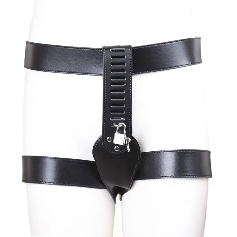 Пояс целомудрия из искусственной кожи состоит из поясного ремня и второго ремня, который идет между ножками, выдыхает в форме песочных часов, покрывая область полового органа и анального отверстия. Он обеспечивает покрытие спереди и сзади, сужаясь между ногами, чтобы соответствовать анатомии таза.