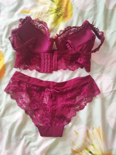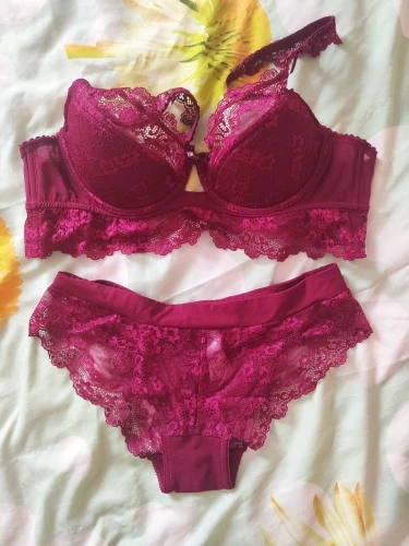 неплохой комплект за свою цену. цвет скорее не красное вино, а больше вишня. на параметры: грудь 93см, под грудью 73, бедра 94 продавец посоветовал 75D, сел впритык и в объеме, и в чашке, трусики не давят, но скатываются спереди на сгибе. лиф без пушапа, кружево снизу сидит не плотно, провисает, из-за этого широкая застежка абсолютно бесполезна, т.к. держит всё равно один крючок. доставка 2 недели до Москвы.