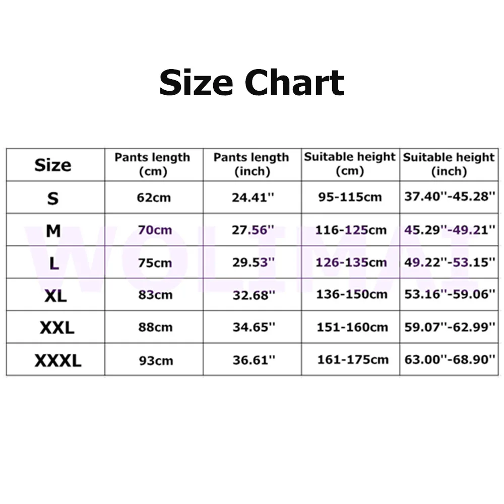 Размер S: Длина брюк: 62 см/24,41 дюймаПодходящая высота: 95 - 115 см/37,40 ''-45,28''Размер M: Длина брюк: 70 см/27,56 дюймаПодходящий рост: 116 - 125 см/45,67 ''-49,21''Размер L: Длина брюк: 75 см/29,53 дюймаПодходящая высота: 126 - 135 см/49,61 ''-53,15''Размер XL: Длина брюк: 83 см/32,68 дюймаПодходящая высота: 136 - 150 см/53,54 ''-59,06''Размер XXL: Длина брюк: 88 см/34,65 дюймаПодходящий рост: 151 - 160 см/59,45 ''-62,99''