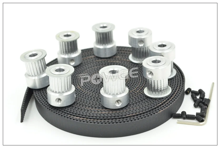 Комплектация включает в себя следующее: 8 шт.X 20 зубьев 2GT алюминиевые шкивы5/6. 35/8 мм диаметр16 pcsx M4 винты(Бесплатно)1 шт. х шестигранный ключ(Бесплатно)5 метровX 2GT резиновый Открытый ремень (2 мм Шаг xШирина 9 мм)