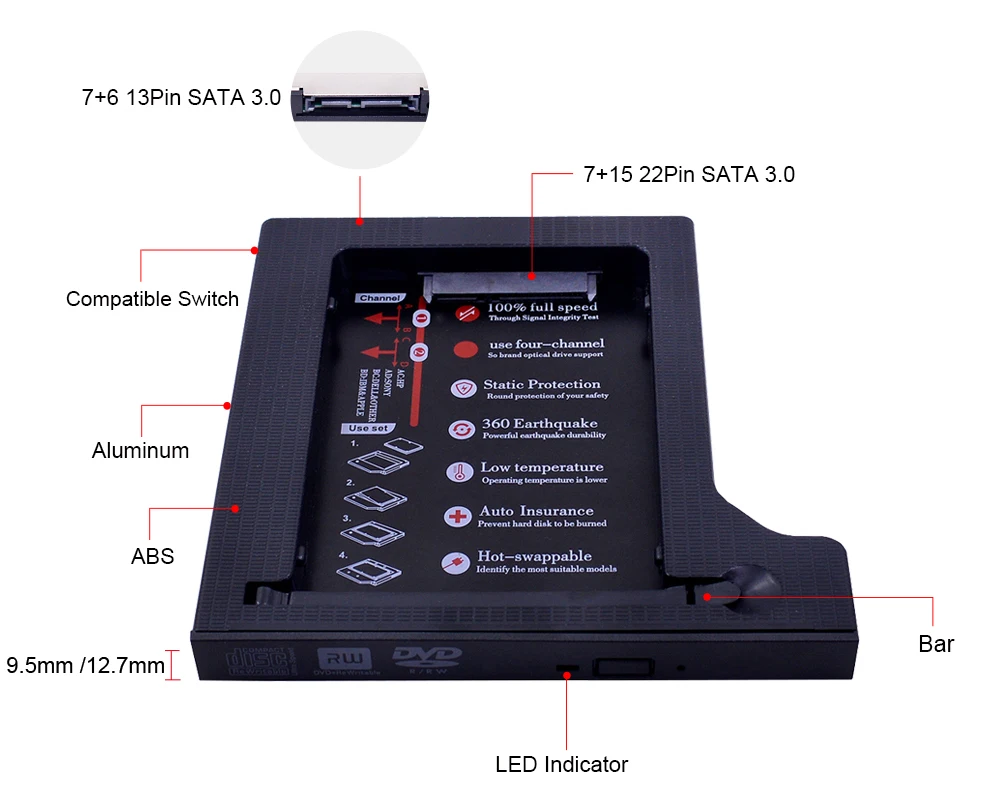 Универсальный корпус CHIPAL для второго жесткого диска, 12,7 мм 9,5 мм SATA 3,0 2,5 дюйма, корпус SSD, корпус для жесткого диска со светодиодным индикатором для ноутбука, CD-Корпус для ноутбука DVD ROM Optibay