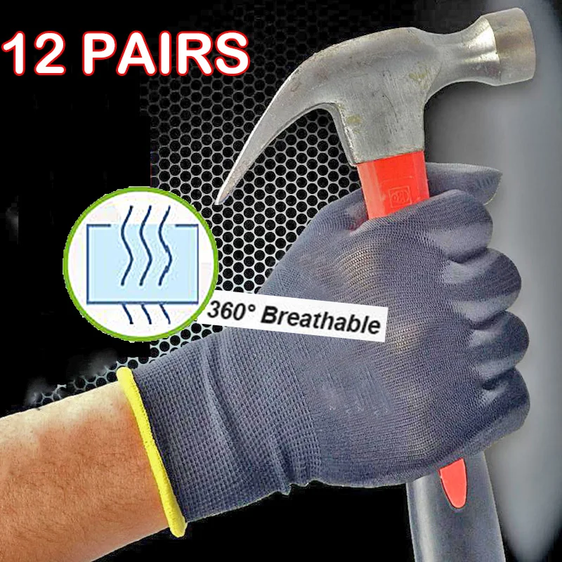 12 пар, черные защитные рабочие перчатки из нейлона и полиуретана