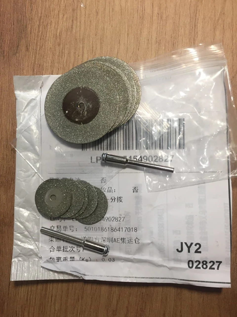 Заказ доставлен быстро в объединённой посылке, в дороге не повредился, хотя был упакован в обыкновенный серый пакет. Абразив на диски нанесён относительно плотно и ровно. Держатель из комплекта не использую, т.к. имею свой, сделанный и отцентрованный на токарном станке. Проверил рез по текстолиту и алюминию, биений почти нет, абразив на диске устоял. Как будет держаться долго - покажет время использования дисков. Работой продавца доволен.
