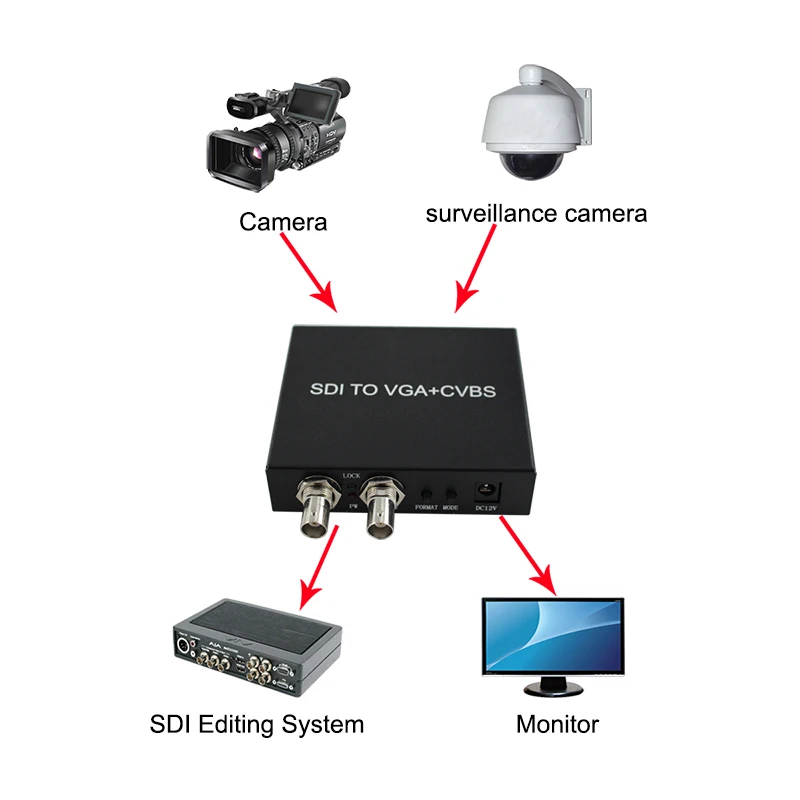 Этот преобразователь SDI в VGA + CVBS может преобразовывать SDI (SDI-SDI/HD-SDI/3G-SDI) сигнал в VGA или AV сигнал, И он включает входной порт SDI и выходной порт SDI одновременно, поддерживает FULL-HD вход и выход SDI, также очень прост в использовании стабильно и надежно.