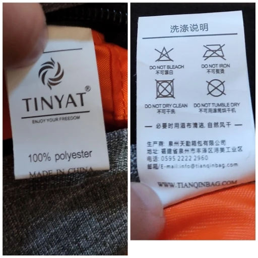 Сумка нравится,молнии работают хорошо,на оранжевом материале сумки имеются еле заметные логотипы сумки(TINYAT).Заказывал 11.11 за 100р.(с применением купона).В процессе отправки оказалось,что цвет который мне нужен был не было в наличии и мы договорились на серый цвет.Заказ продавец отправил 14.11 и он не двигался. Изменения в доставке произошли после того,как я написал продавцу 18.11 и 20.11 заказ был уже у меня.Продавец очень общительный, рекомендую.Курьер прежде чем доставить до двери, позвонил и спросил, когда мне удобно получить заказ.Доставка производилась службой IML,если заказывать доставкой из РФ,то склад у них в Москве