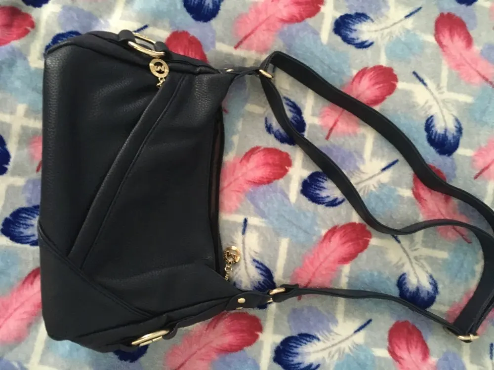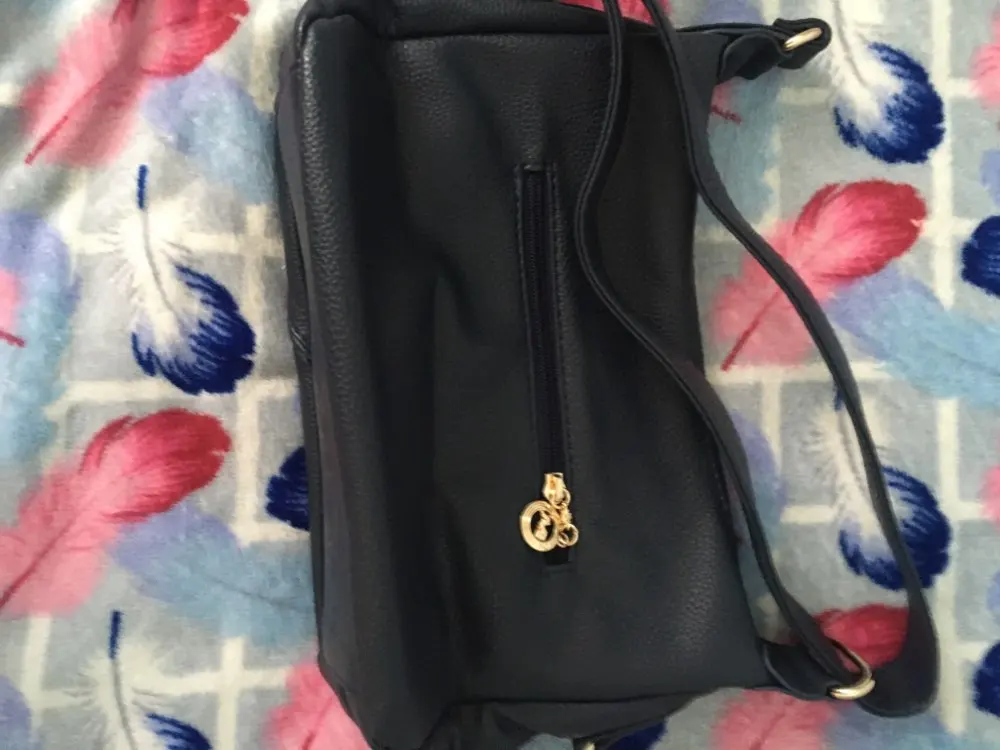 Сумка маленькая, но очень вместительная (мое все поместилось, в отличая от некоторых сумок). Все заклепки замки золотого цвета, серебром смотрелось бы лучше. С лицевой стороны сумки, замок карман это не обманка. Но я довольна.